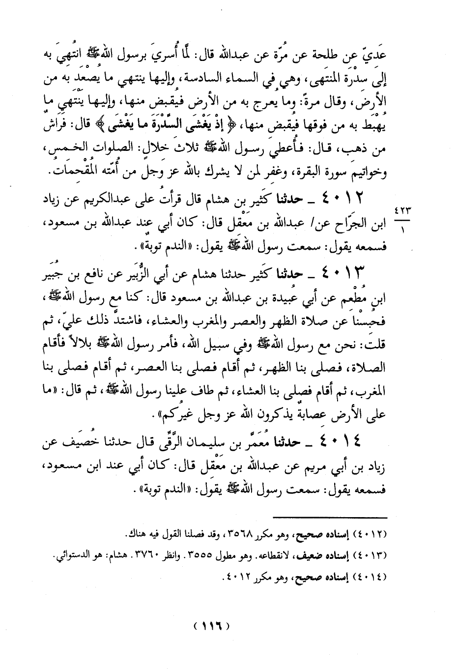 عَديّ عن طلحة عن مُرّة عن عبد الله قال: لمَّا أُسريَ برسول الله - صلى الله عليه وسلم - انُتهِي به