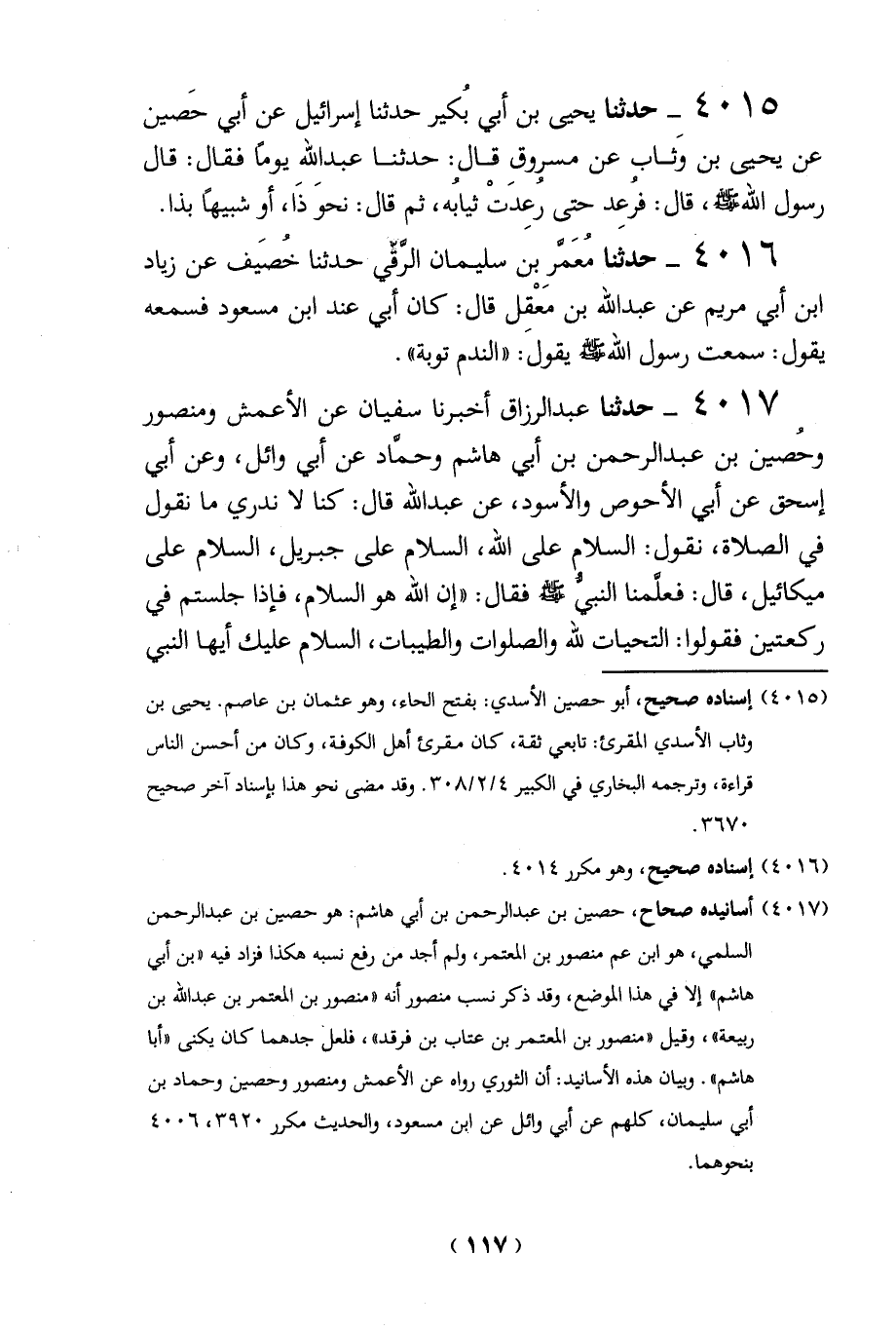 4016 - حدثنا مُعَمَّر بن سليمان الرقي حدثنا خُصَيف عن زياد ابن أبي مريم عن عبد الله بن مَعْقل قال: كان أبي عند ابن مسعود فسمعه يقول: سمعت رسول الله - صلى الله عليه وسلم - يقولَ: "الندم توبة". 4017 - حدثنا عبد الرزاق أخبرنا سفيان عن الأعمش ومنصور وحُصين بن عبد الرحمن بن أبي هاشم وحماد عن أبي وائل، وعن أبي إسحق عن أبي الأحوص والأسود، عن عبد الله قال: كنا لا ندري ما نقول في الصلاة، نقول: السلام على الله، السلام على جبريل، السلام على