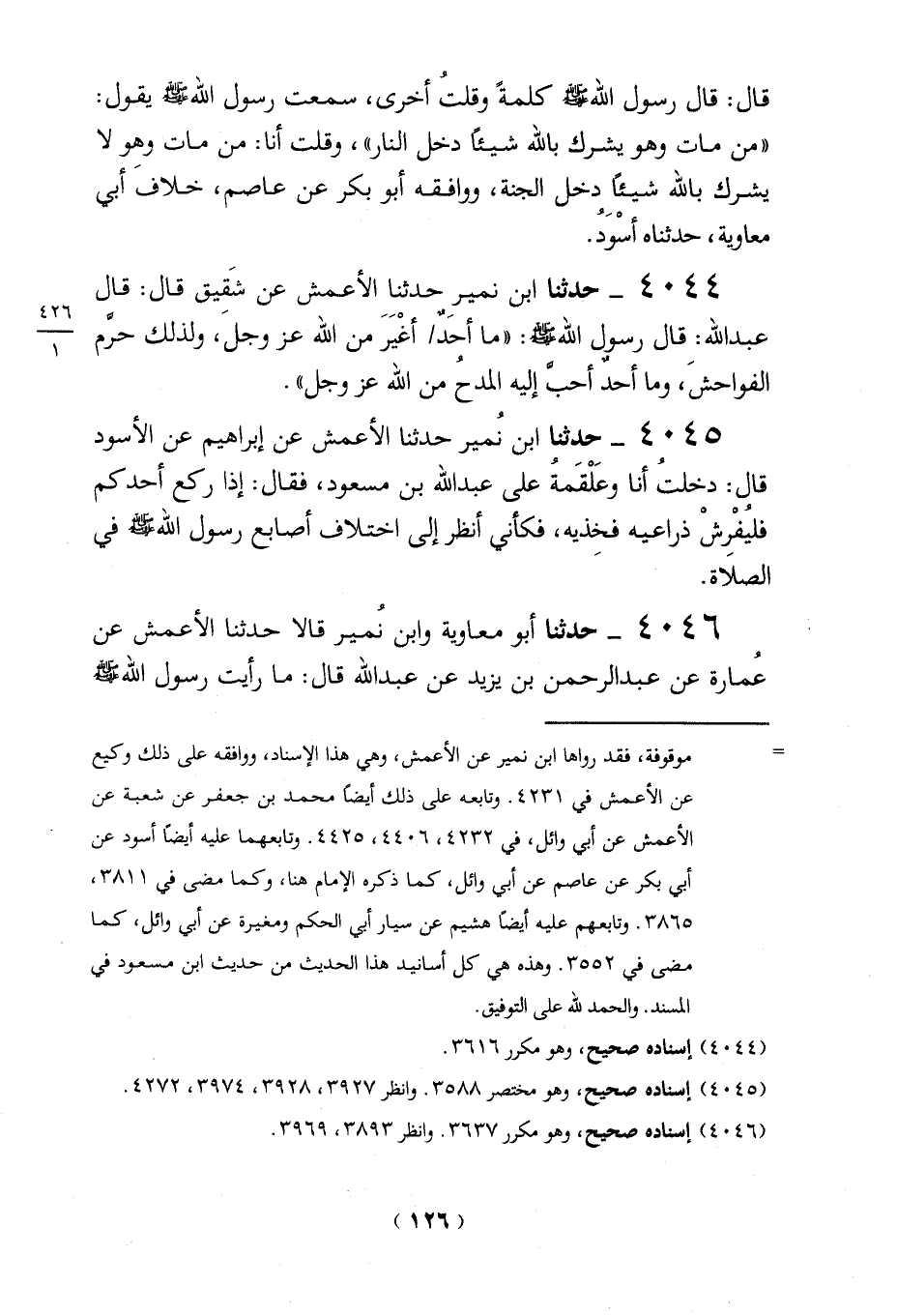 4046 - حدثنا أبو معاوية وابن نُمير قالا حدثنا الأعمش عن عُمارة عن عبد الرحمن بن يزيد عن عبد الله قال: ما رأيت رسول الله - صلى الله عليه وسلم -