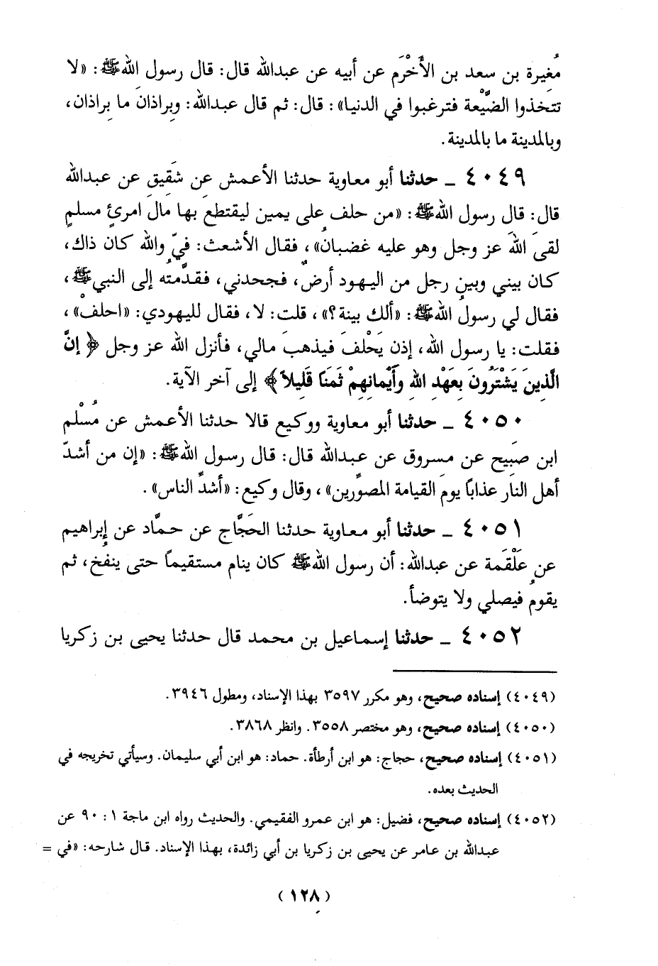 4049 - حدثنا أبو معاوية حدثنا الأعمش عن شَقيق عن عبد الله قال: قال رسول الله - صلى الله عليه وسلم -: "من حلف على يمين ليقتطعَ بها مَالَ امرئٍ مسلمٍ لقىَ الله عز وجل وهو عليه غضبانُ"، فقال الأشعث: فيّ والله كان ذاك، كان بيني وبين رجل من اليهود أرضٌ، فجحدني، فقدمتُه إلى النبي - صلى الله عليه وسلم -، فقال لي رسولُ الله - صلى الله عليه وسلم -: "ألك بينة؟ "، قلت: لا، فقال لليهودي: "احلفْ"، فقلت: يا رسول الله، إذن يَحْلفَ فيذهبَ مالي، فأنزل الله عز وجل {إِنَّ الَّذِينَ يَشْتَرُونَ بِعَهْدِ اللَّهِ وَأَيْمَانِهِمْ ثَمَنًا قَلِيلًا} إلى آخر الآية.