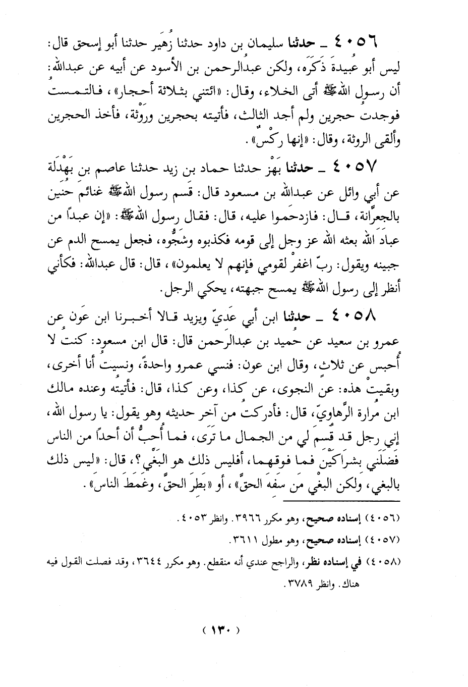 4056 - حدثنا سليمان بن داود حدثنا زهَير حدثنا أبو إسحق قال: ليس أبو عُبيدةَ ذَكَرَه، ولكن عبدُ الرحمن بن الأسود عن أبيه عن عبد الله: أن رسول الله -صلي الله عليه وسلم- أتى الخلاء، وقال: "ائتني بثلاثة أحجار"، فالتمستُ فوجدتُ حجرين ولم أجد الثالث، فأتيته بحجرين ورَوْثة، فأخذ الحجرين وألقى الروثة، وقال: "إنها ركْسٌ".