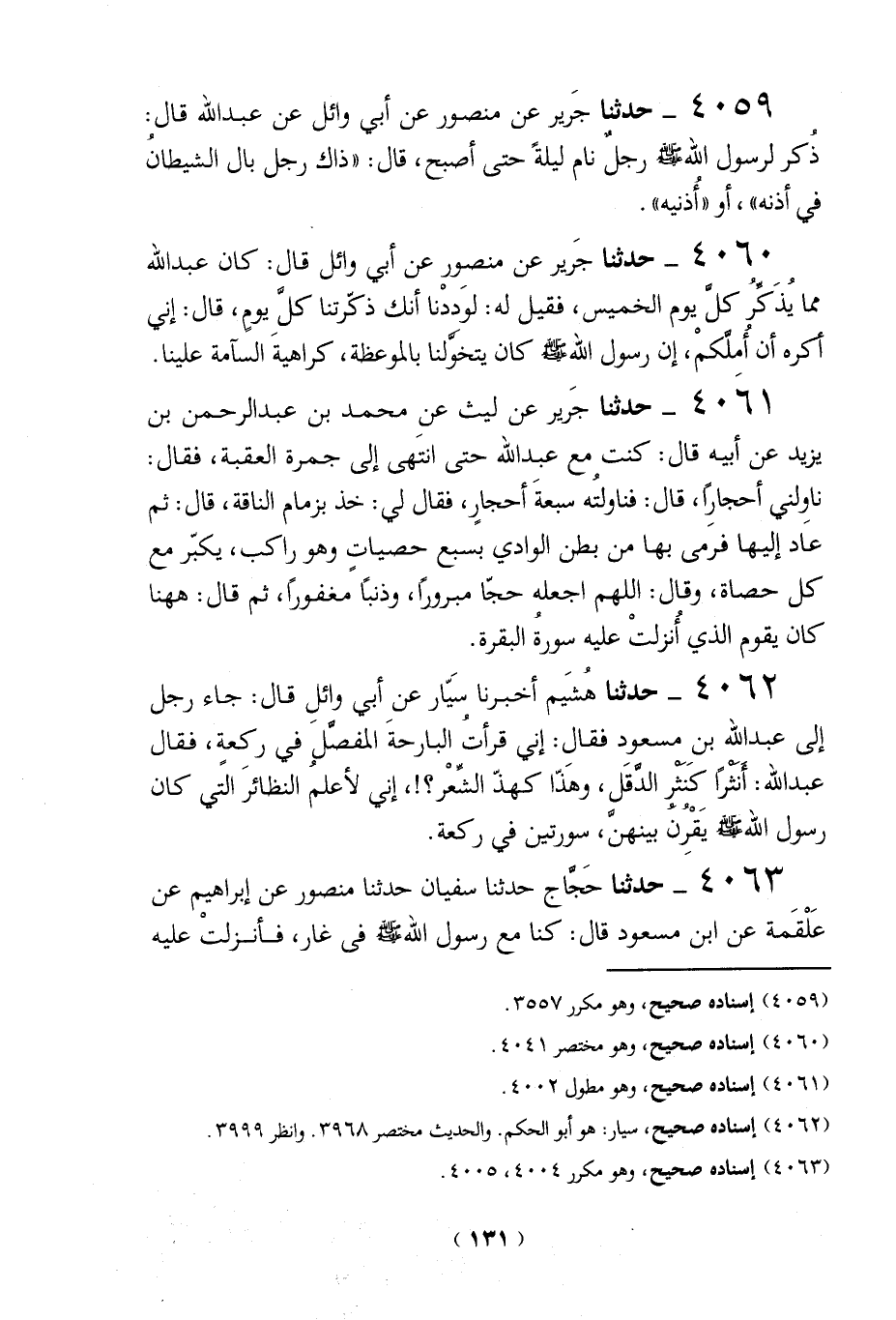 4061 - حدثنا جَرير عن ليث عن محمد بن عبد الرحمن بن يزيد عن أبيه قال: كنت مع عبد الله حتى انتَهى إلى جمرة العقبة، فقال: ناوِلني أحجارِاً، قال: فناولتُه سبعةَ أحجارٍ، فقال لي: خذ بزمام الناقة، قال: ثم عاد إليها فرمى بها من بطن الوادي بسبع حصياتٍ وهو راكب، يكبّر مع كل حصاة، وقال: اللهم اجعله حجّا مبروراً، وذنباً مغفوراً، ثم قال: ها هنا كان يقوم الذي أُنزلتْ عليه سورةُ البقرة.