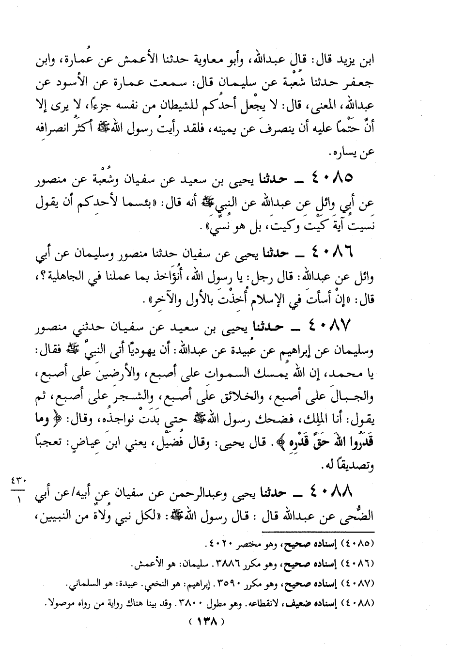 4087 - حدثنا يحيى بن سعيد عن سفيان حدثني منصور وسليمان عن إبراهيم عن عبيدة عن عبد الله: أن يهودياً أتى النبيَّ - صلى الله عليه وسلم - فقال: يا محمد، إن الله يُمسك السموات على أصبع، والأرضِينَ على أصبع، والجبالَ على أصبع، والخلائق علَى أصبع، وِالشجرَ على أصبع، ثم