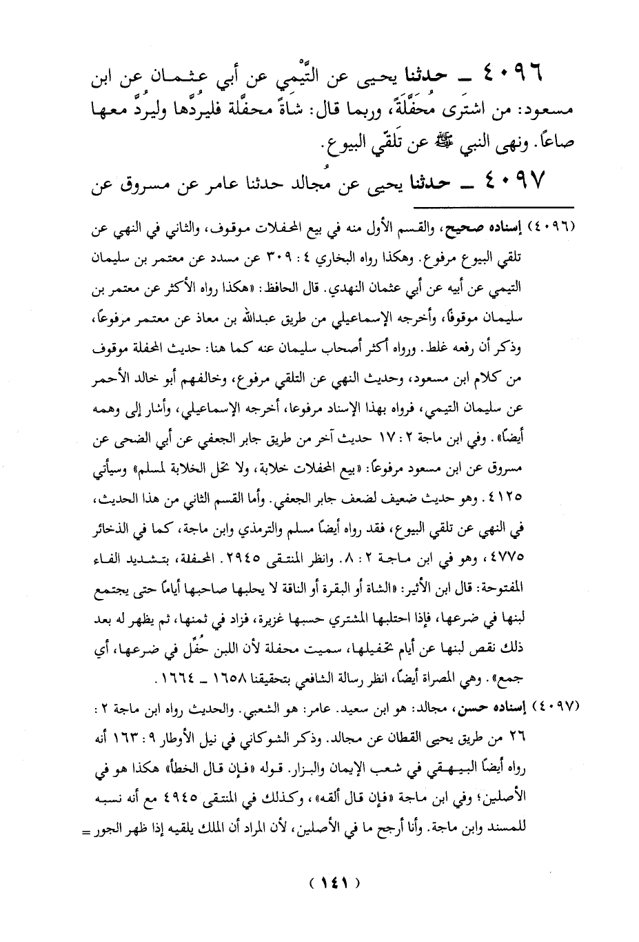 4096 - حدثنا يحيى عن التَّيْمِي عن أبي عثمان عن ابن مسعود: من اشتَرى مُحَفَّلَةً، وربما قال: شاةً محفَّلة فليرُدَّها وليُردَّ معها صاعاً. ونهى النبي - صلى الله عليه وسلم - عن تَلقّي البيوع.
