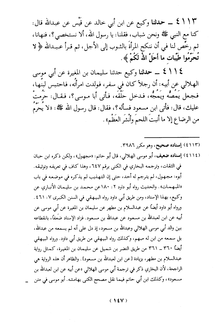 4113 - حدثنا وكيع عن ابن أبي خالد عن قَيْس عن عبد الله قال: كنا مع النبي - صلى الله عليه وسلم - ونحن شباب، فقلنا: يا رسول الله، ألا نستخصي؟، فنهانا، ثم رخَّص لنا في أن ننكح المرأةَ بالثوب إلى الأجل، ثم قرأ عبد الله {لَا تُحَرِّمُوا طَيِّبَاتِ مَا أَحَلَّ اللَّهُ لَكُمْ}.