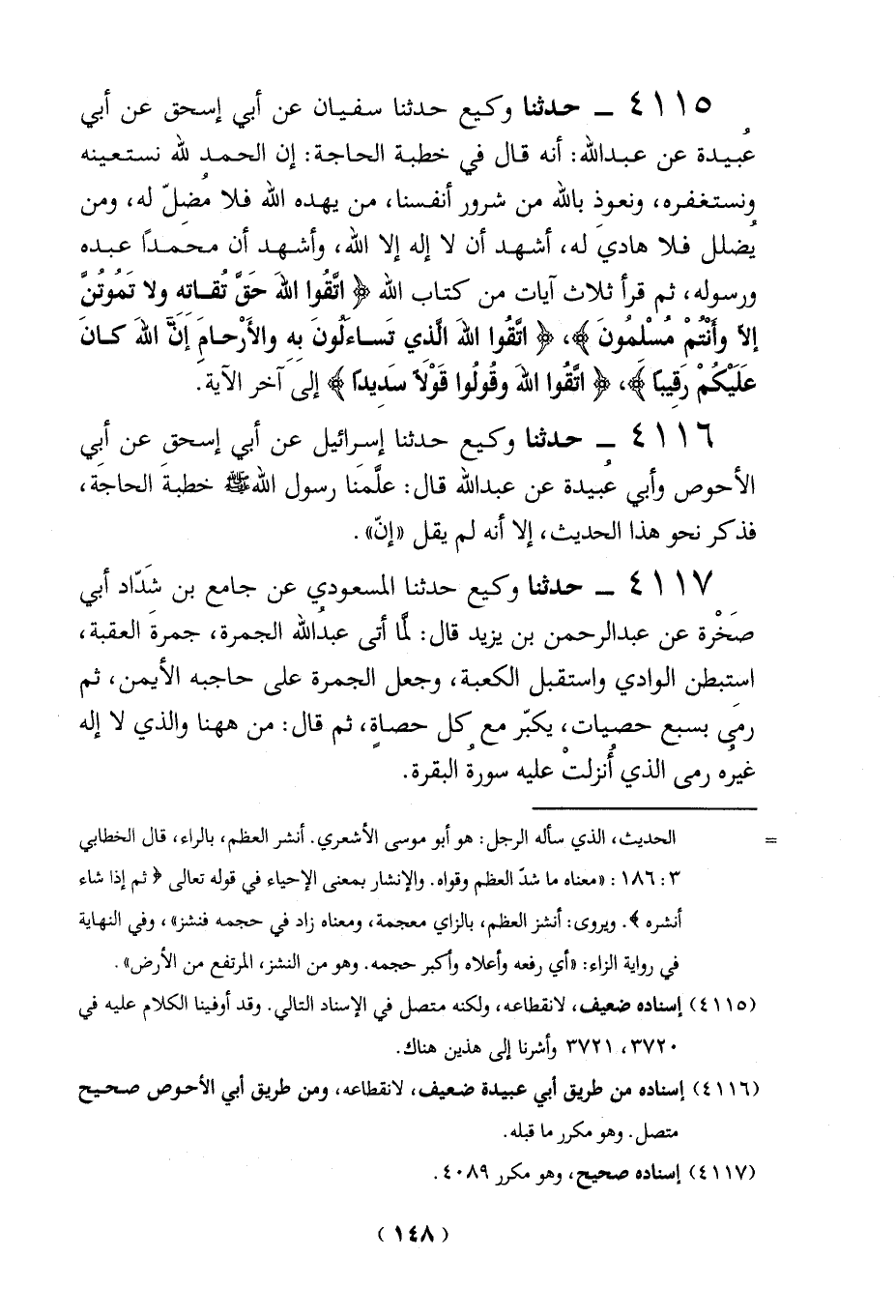 4115 - حدثنا وكيع حدثنا سفيان عن أبي إسحق عن أبي عُبيدة عن عبد الله: أنه قال في خطبة الحاجة: إن الحمد لله نستعينه ونستغفره، ونعوذِ بالله من شرور أنفسنا، من يهده الله فلا مُضلّ له، ومن يضلل فلا هادي له، أشهد أن لا إله إلا الله، وأشهد أن محَمداً عبده ورسوله، ثم قرأ ثلاث آيات من كتاب الله {اتَّقُوا اللَّهَ حَقَّ تُقَاتِهِ وَلَا تَمُوتُنَّ إِلَّا وَأَنْتُمْ مُسْلِمُونَ} {وَاتَّقُوا اللَّهَ الَّذِي تَسَاءَلُونَ بِهِ وَالْأَرْحَامَ إِنَّ اللَّهَ كَانَ عَلَيْكُمْ رَقِيبًا (1)}. {اتَّقُوا اللَّهَ وَقُولُوا قَوْلًا سَدِيدًا (70)} إلى آخر الآية