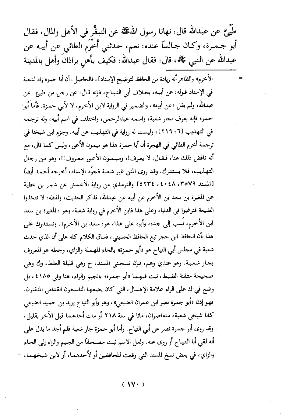 = الأخرم" والظاهر أنه زيادة من الحافظ لتوضيح الإسناد]، فالحاصل: أن أبا حمزة زاد لشعبة في الإسناد قوله: عن أبيه، بخلاف أبي التياح، فإنه قال: عن رجل من طيئ عن عبد الله، ولم يقل "عن أبيه"، والضمير في الرواية لابن الأخرم، لا لأبي حمزة. فأما أبو حمزة فإنه يعرف بجار شُعبة، واسمه عبد الرحمن، واختلف في اسم أبيه، وله ترجمة في التهذيب [6: 219] وليست له رولة في التهذيب عن أبيه. وجزم ابن شيخنا في ترجمة أخرم الطائي في الهجرة أن أبا حمزة هذا هو ميمون الأعور، وليس كما قال، مع أنه ناقض ذلك هنا، فقال: لا يعرف!، وميمون الأعور معروف!!، وهو من رجال التهذيب، فلا يستدرك. وقد روى المتن غير شُعبة فجوَّد الإسناد، أخرجه أحمد أيضاً [المسند 3579، 4048، 4234] والترمذي من رواية الأعمش عن شمر بن عطية عن المغيرة بن سعد بن الأخرم عن أبيه عن عبد الله، فذكر الحديث، ولفظه: لا تتخذوا الضيعة فترغبوا في الدنيا، وعلى هذا فابن الأخرم في رواية شُعبة، وهو: المغيرة بن سعد ابن الأخرم، نُسب إلى جده، وأبوه على هذا، هو: سعد بن الأخرم". ونستدرك على هذا بأن الحافظ ابن حجر تبع الحافظ الحسيني، فساق الكلام كله على أن الذي حدث شُعبة في مجلس أبي التياح هو "أبو حمزة" بالحاء المهملة والزاي، وجعله هو المعروف