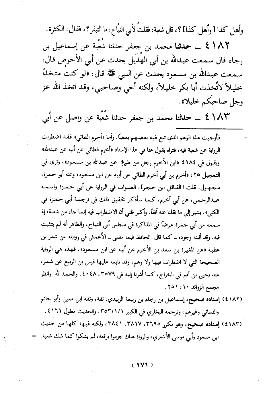 4182 - حدثنا محمد بن جعفر حدثنا شُعْبة عن إسماعيل بن رجاء قال سمعت عبد الله بن أبي الهُذَيل يحدث عن أبي الأحوص قال: سمعت عبد الله بن مسعود يحدث عن النبي - صلى الله عليه وسلم - قال: "لو كنتُ متخذاً خليلاً لاتخَّذت أبا بكر خليلاً، ولكنه أخي وصاحبي، وقد اتخذ الله عز وجل صاحبَكم خليلا".