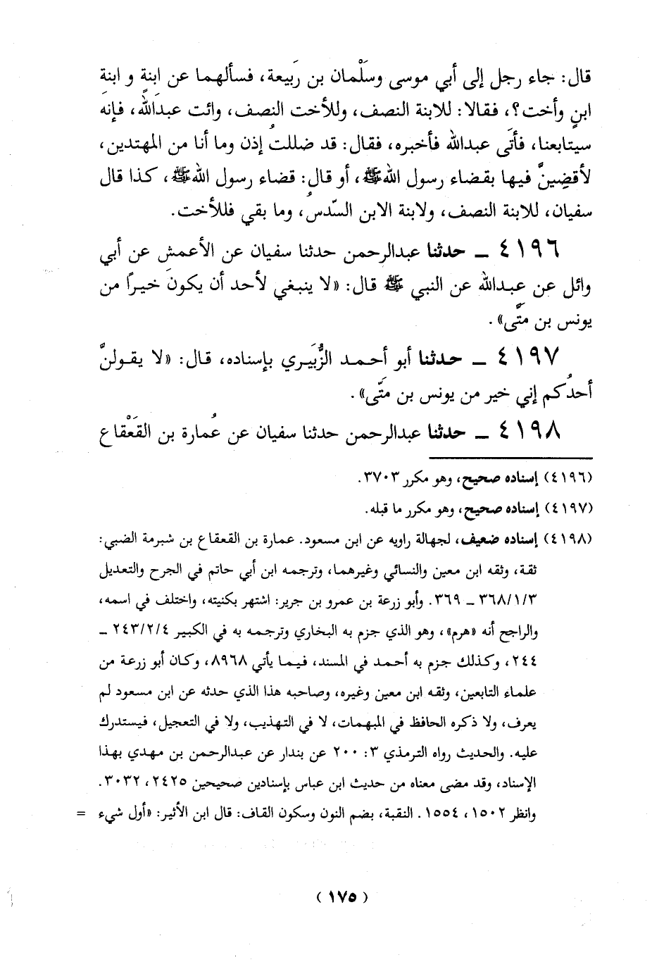 4196 - حدثنا عبد الرحمن حدثنا سفيان عن الأعمشِ عن أبي وائل عن عبد الله عن النبي - صلى الله عليه وسلم - قال: "لا ينبغي لأحد أن يكون خيراً من يونس بن مَتَّى".