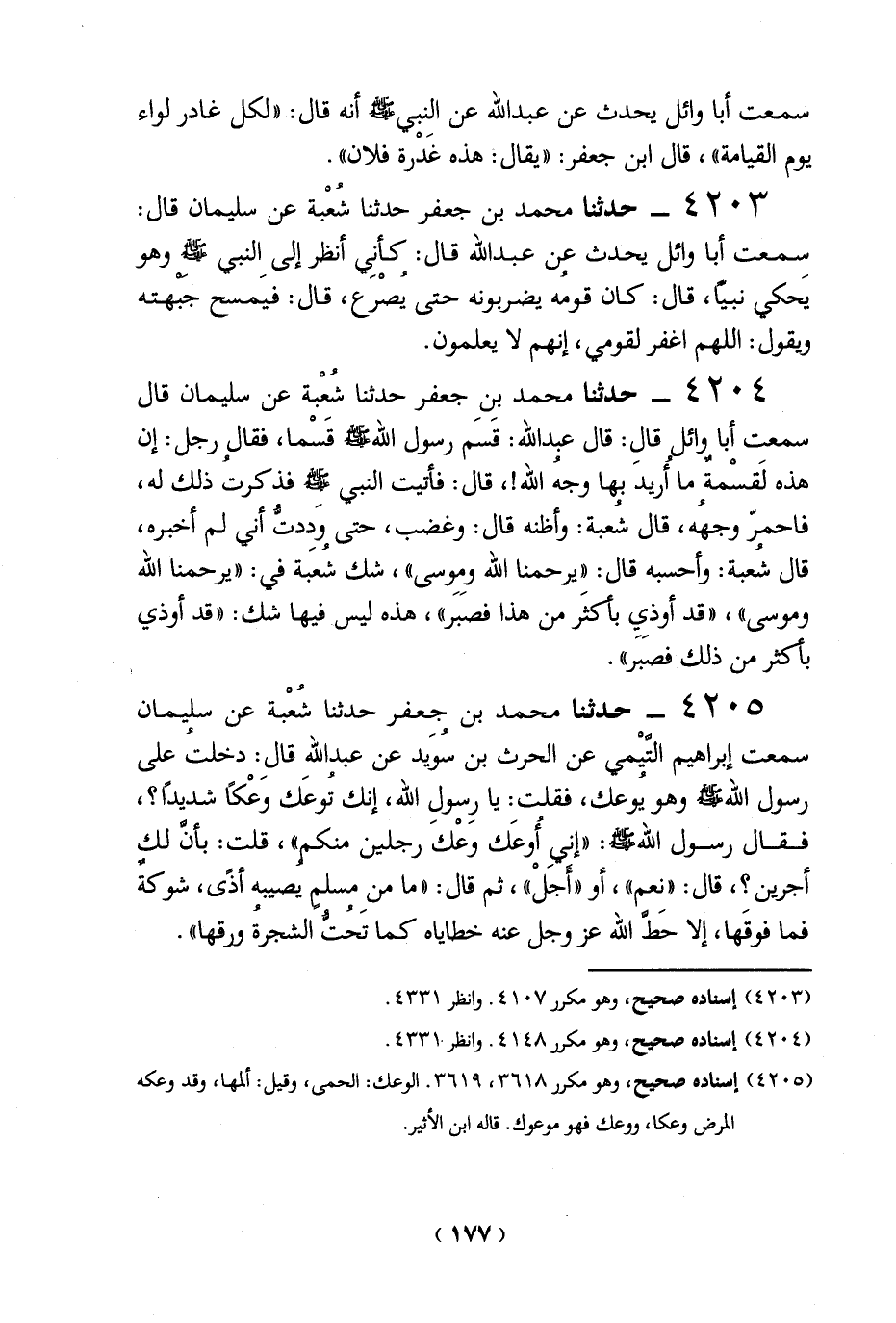 4204 - حدثنا محمد بجعفر حدثنا شُعْبة عن سليمان قال سمعت أبا وائل قال: قال عبد الله: قسم رسول الله - صلى الله عليه وسلم - قَسْما، فقال رجل: إن هذه لَقسْمةٌ ما أُريدَ بها وجه الله!، قال: فأتيت النبي - صلى الله عليه وسلم - فذكرتُ ذلك له، فاحمرّ وجهُه، قال شُعبة: وأظنه قال: وغضب، حتى ودِدتُّ أني لم أخبره، قال شُعبة: وأحسبه قال: "يرحمنا الله وموسى"، شك شُعبة في: "يرحمنا الله وموسى"، "قد أوذيٍ بأكثَر من هذا فصَبَر"، هذه ليس فيها شك: "قد أوذي بأكثر من ذلك فصَبَر".