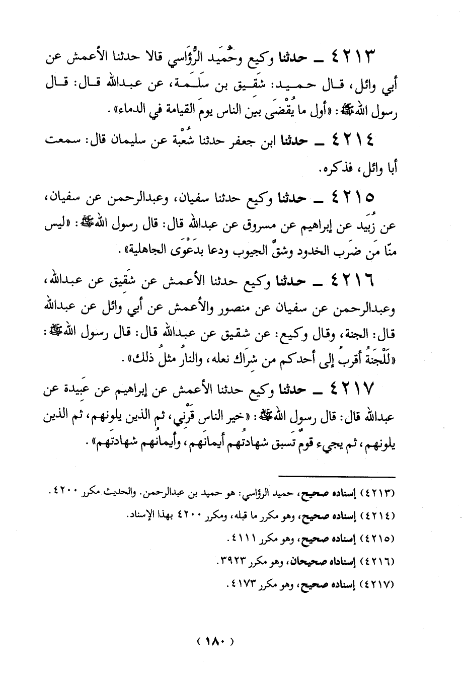 4213 - حدثنا وكيع وحمَيَد الرُّؤاسي قالا حدثنا الأعمش عن أبي وائل، قال حميد: شَقيق بن سَلَمة، عن عبد الله قال: قال رسول الله - صلى الله عليه وسلم -: "أول ما يُقْضَي بيَن الناس يومَ القيامة في الدماء".