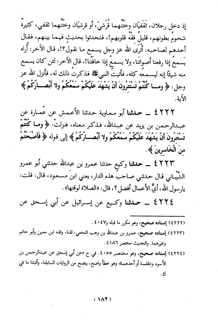 4222 - حدثنا أبو معاوية حدثنا الأعمش عن عُمارة عن عبد الرحمن بن يزيد عن عبد الله، فذكر معناه، فنزلتْ: {وَمَا كُنْتُمْ تَسْتَتِرُونَ أَنْ يَشْهَدَ عَلَيْكُمْ سَمْعُكُمْ وَلَا أَبْصَارُكُمْ} إلى قوله {فَأَصْبَحْتُمْ مِنَ الْخَاسِرِينَ}.