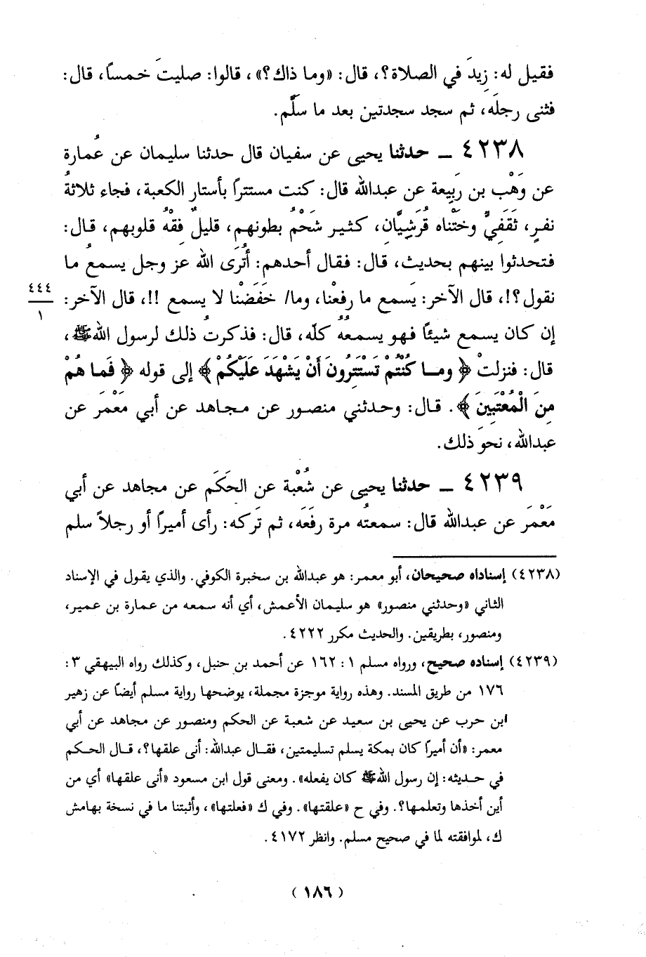 (4238) إسناداه صحيحان، أبو معمر: هو عبد الله بن سخبرة الكوفي. والذي يقول في الإسناد الثاني "وحدثني منصور" هو سليمان الأعمش، أي أنه سمعه من عمارة بن عمير، ومنصور، بطريقين. والحديث مكرر 4222.