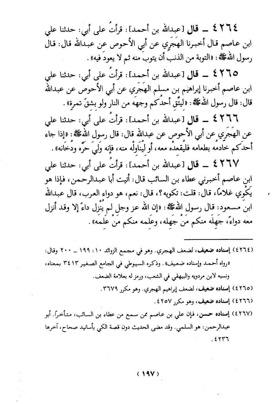4264 - قال [عبد الله بن أحمد]: قرأتُ على أبي: حدثنا على ابن عاصم قال أخبرنا الهَجَرِي عن أبيِ الأحوص عِن عبد الله قال: قال رسول الله - صلى الله عليه وسلم -: "التوبة من الذنب أن يتوب منه ثم لا يعودَ فيه".