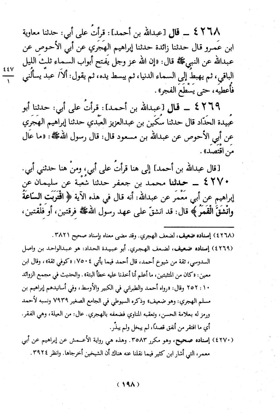 4268 - قال [عبد الله بن أحمد]: قرأتُ على أبي: حدثنا معاوية ابن عَمرو قال حدثنا زائدة حدثنا إبراهيم الهَجَري عن أبي الأحوص عن عبد الله عن النبي - صلى الله عليه وسلم - قال: "إن الله عز وجل يَفتح أبواب السماء ثلثَ الليل الباقيِ، ثم يهبطُ إلىِ السماء الدنيا، ثم يبسط يده، ثم يقول: ألاَ عبدٌ يسألني فأُعطيه، حتى يَسْطَع الفجر".