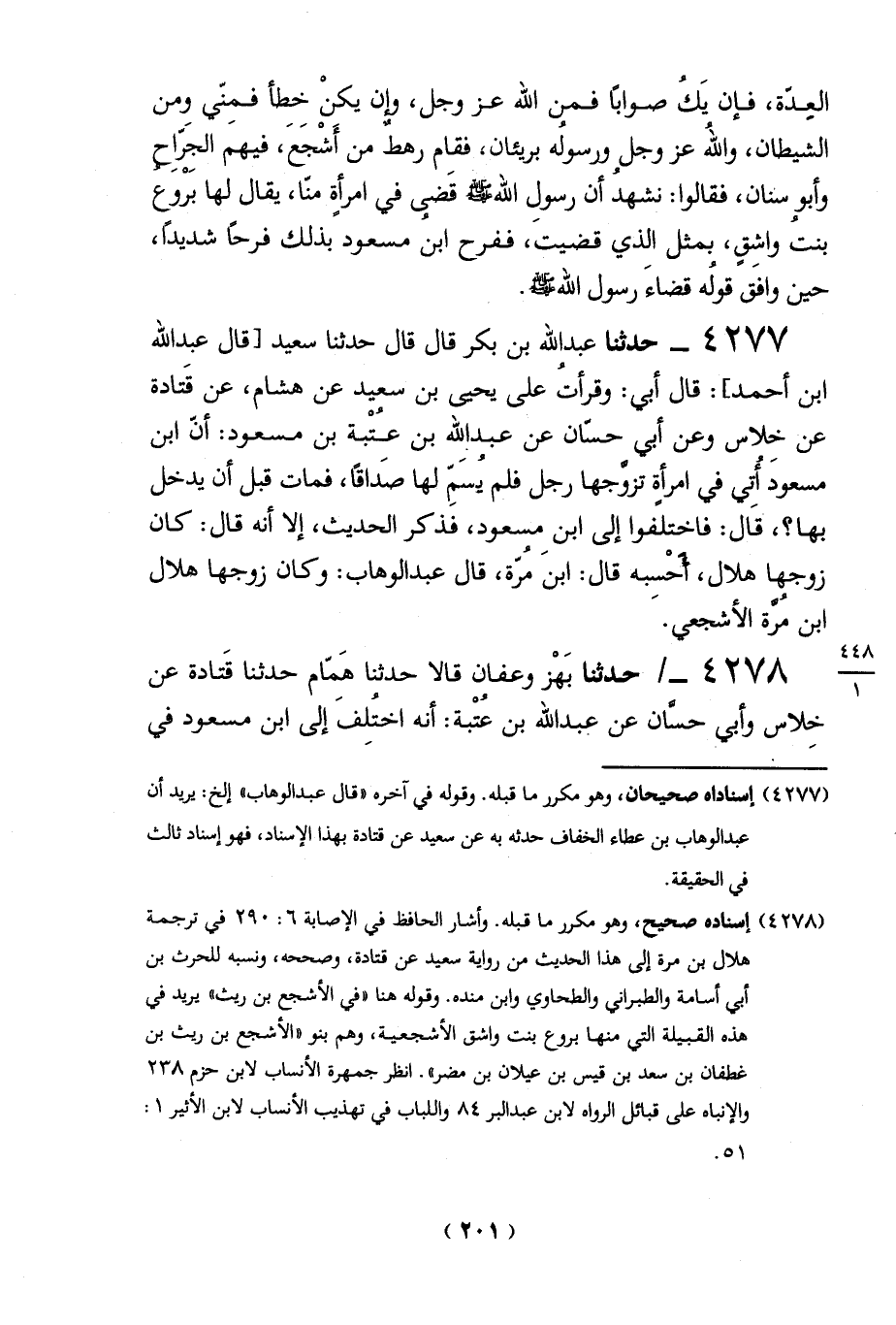 4277 - حدثنا عبد الله بن بكر قال قال حدثنا سعيد [قال عبد الله ابن أحمد]: قال أبي: وقرأتُ على يحيى بن سعيد عن هشام، عن قَتادة عن خلاس وعن أبي حسَّان عن عبد الله بن عُتْبة بن مسعود: أنّ ابن مسعودَ أُتى في امرأة تزوَّجها رجل فلم يُسمِّ لها صَداقاً، فمات قبل أن يدخل بها؟، قال: فاختلفوا إلى ابن مسعود، فذكر الحديث، إلا أنه قال: كان زوجها هلال، أحَسِبه قال: ابنَ مُرّة، قال عبد الوهاب: وكان زوجها هلال ابن مُرَّة الأشجعي.