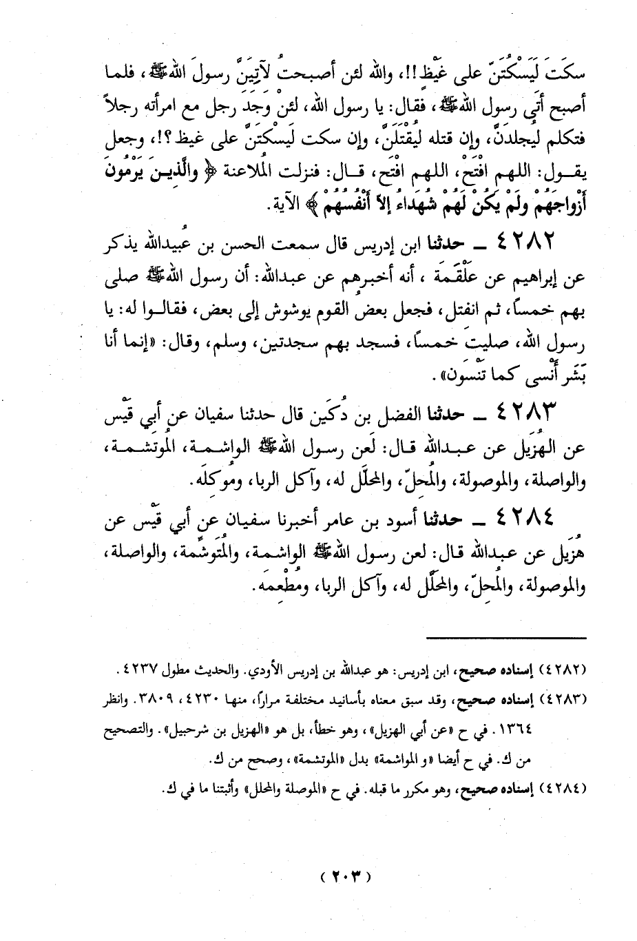 4283 - حدثنا الفضل بن دُكَين قال حدثنا سفيان عن أبي قَيس عن الهُزَيل عن عبد الله قال: لَعن رسول الله - صلى الله عليه وسلم - الواشمة، المُوتَشمة، والواصلة، والموصولة، والمُحلّ، والمحلَّل له، وآكل الربا، ومُوكِلَه.