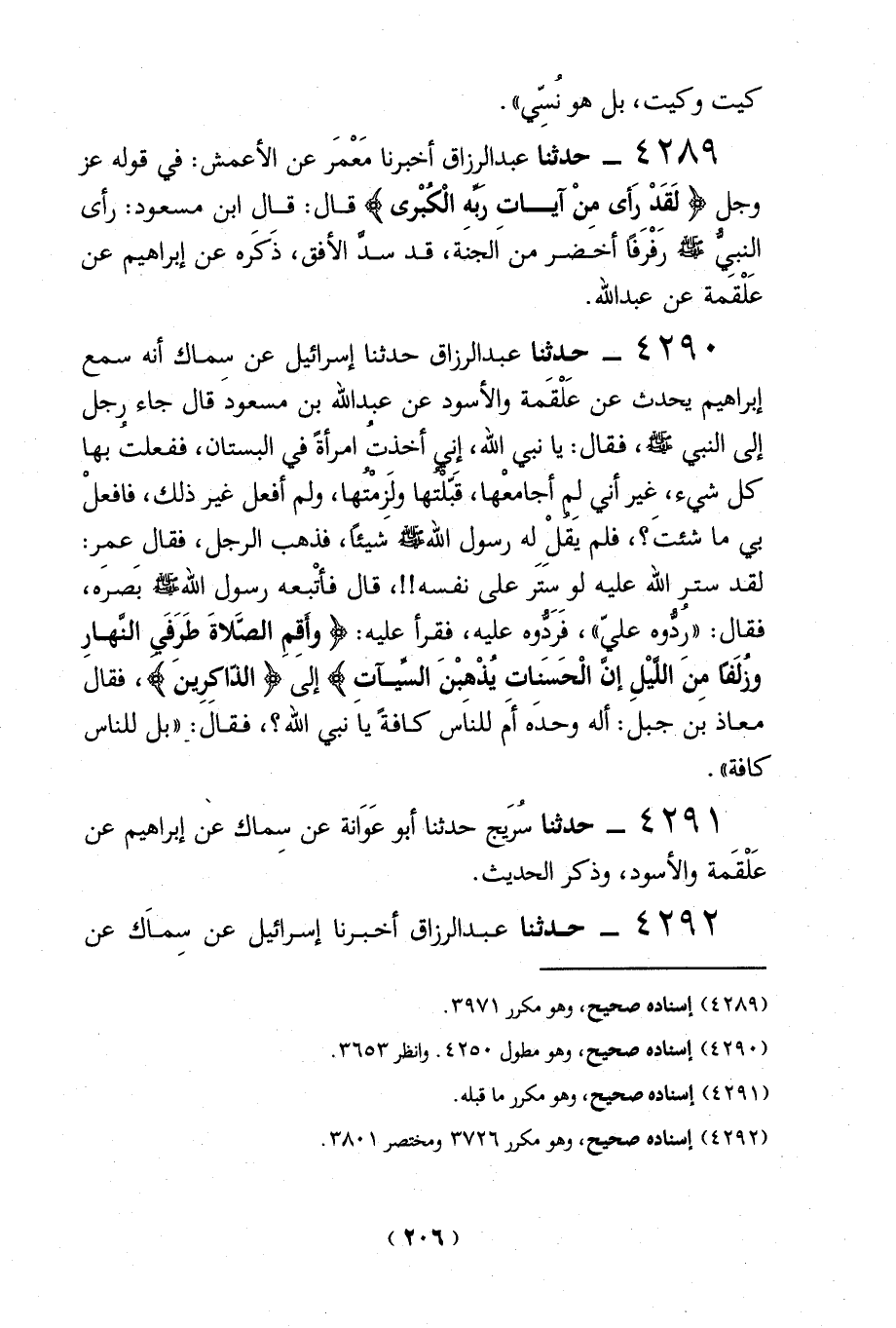 4290 - حدثنا عبد الرزاق حدثنا إسرائيل عن سماك أنه سمع إبراهيم يحدث عن عَلْقَمة والأسود عن عبد الله بن مسعودَ قال جاء رجل إلى النبي - صلى الله عليه وسلم -، فقال: يا نبي الله، إني أخذت امرأةً في البستان، ففعلتُ بها كل شيء، غِير أني لِم أجامعْها، قَبّلتها ولَزمْتُها، ولم أفعل غير ذلك، فافعلْ بي ما شئت؟، فلم يقل له رسول الله - صلى الله عليه وسلم - شَيئاً، فذهب الرجل، فقال عمِر: لقد ستر الله عليه لو ستَر على نفسه!!، قال فأتْبعه رسول الله - صلى الله عليه وسلم - بَصره،