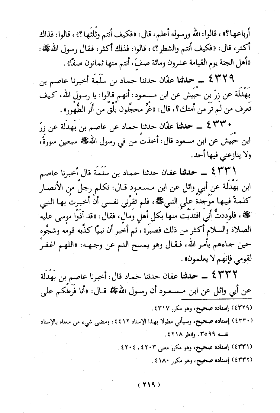 4329 - حدثنا عفان حدثنا حماد بن سَلَمَة أخبرنا عاصم بن بَهْدَلة عن زِرّ بِن حُبَيش عن ابن مسعود: أنهم قالوا: يا رسول الله، كيف تَعرف من لم تَرَ من أمتك؟، قال: "غُرُّ محجَّلون بُلْقٌ من أثَر الطُّهُور".