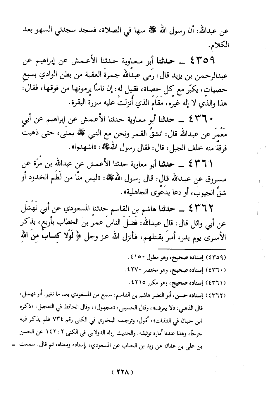 4362 - حدثنا هاشم بن القاسم حِدثنا المسعودي عن أبي نَهْشَل عن أبي وائل قال: قال عبد الله: فَضَلَ الناس عمرُ بن الخطاب بأربع، بذكر الأسرى يوم بدر، أمرَ بقتلهم، فأنزل الله عز وجل {لَوْلَا كِتَابٌ مِنَ اللَّهِ