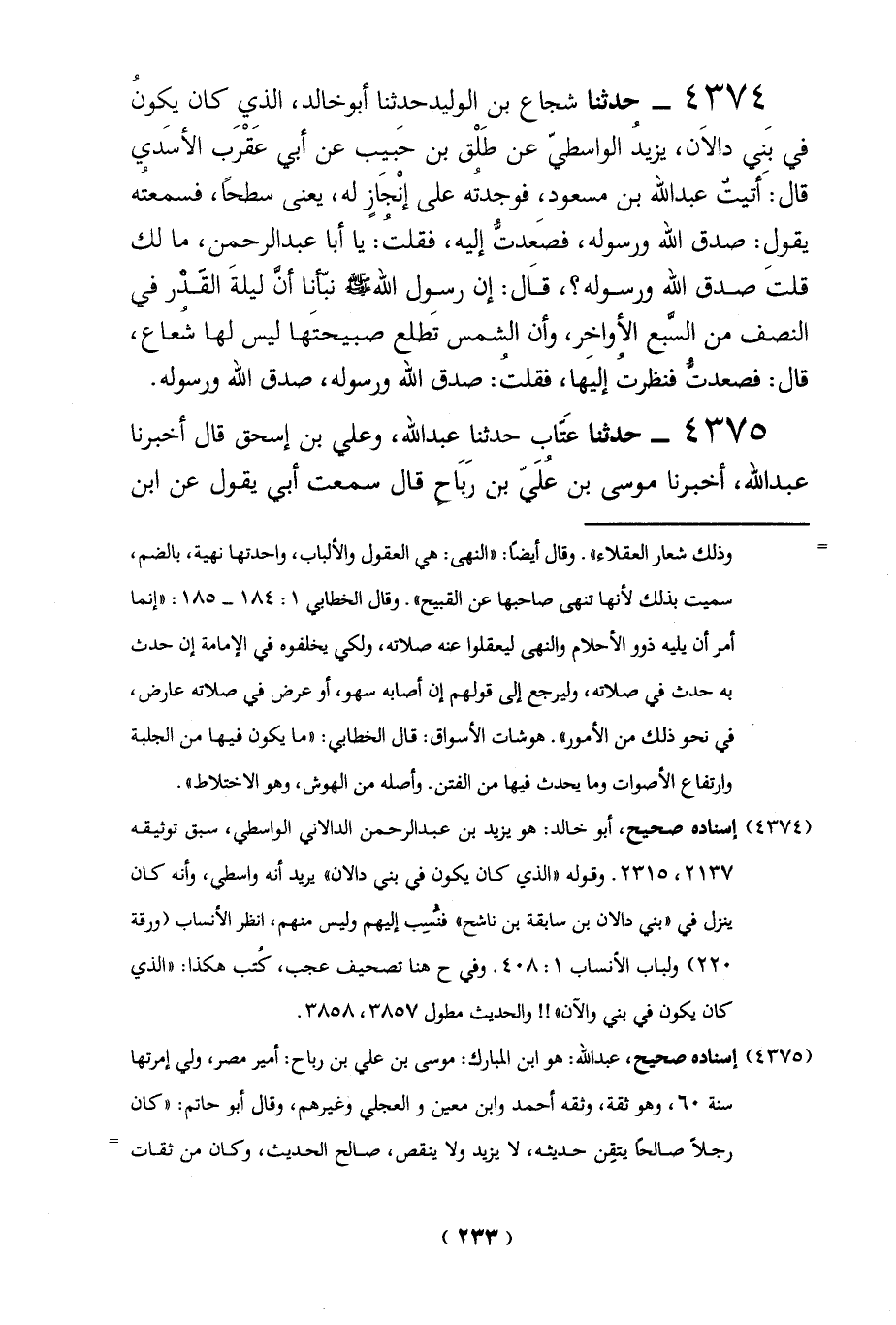 4374 - حدثنا شجاع بن الوليد حدثنا أبوخالد، الذي كان يكونُ في بَنى دالاَن، يزيدُ الواسطيّ عن طَلْق بن حَبيب عن أبي عَقْرَب الأسَدي قال: َ أتيتُ عبد الله بن مسعود، فوجدتُه على إنْجَازٍ له، يعني سطحاً، فسمعتُه يقول: صدق الله ورسوله، فصَعدتُّ إليه، فقلتُ: يا أبا عبد الرحمن، ما لك قلتَ صدق الله ورسوله؟، قَال: إن رسول الله - صلى الله عليه وسلم - نبّأنا أنَّ ليلةَ القَدْر في النصف من السَّبع الأواخر، وأن الشمس تَطلع صبيحتَها ليس لها شُعاع، قال: فصعدتُّ فنظرتُ إليَها، فقلتُ: صدق الله ورسوله، صدق الله ورسوله.