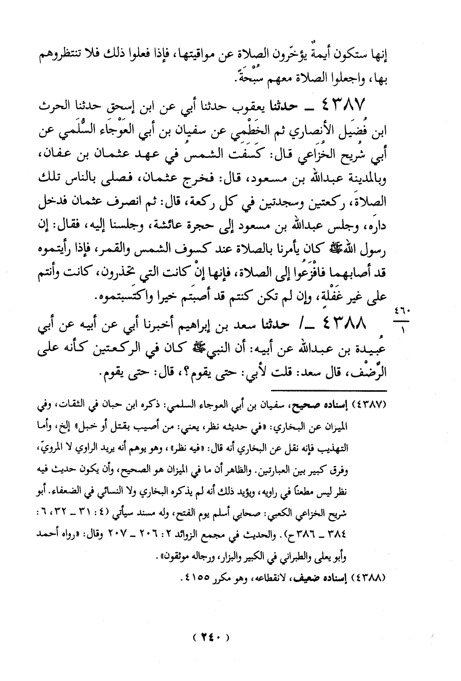 4387 - حدثنا يعقوب حدثنا أبي عن ابن إسحق حدثنا الحرث ابن فُضَيل الأنصاري ثم الخَطْمي عن سفيان بن أبي العَوْجَاء السُّلَمي عن أبي شُريح الخُزَاعي قال: كَسَفَت الشمسُ في عهد عثمان بن عفان،