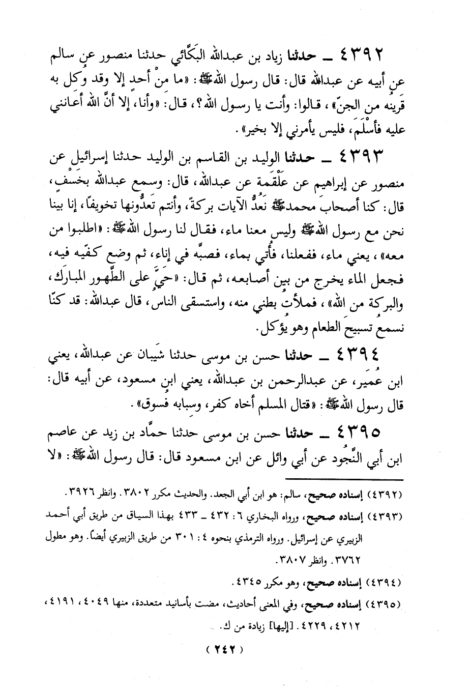 4395 - حدثنا حسن بن موسى حدثنا حمَّاد بن زيد عن عاصم ابن أبي النَّجُود عن أبي وائل عن ابن مسعود قال: قال رسول الله - صلى الله عليه وسلم -:"لا