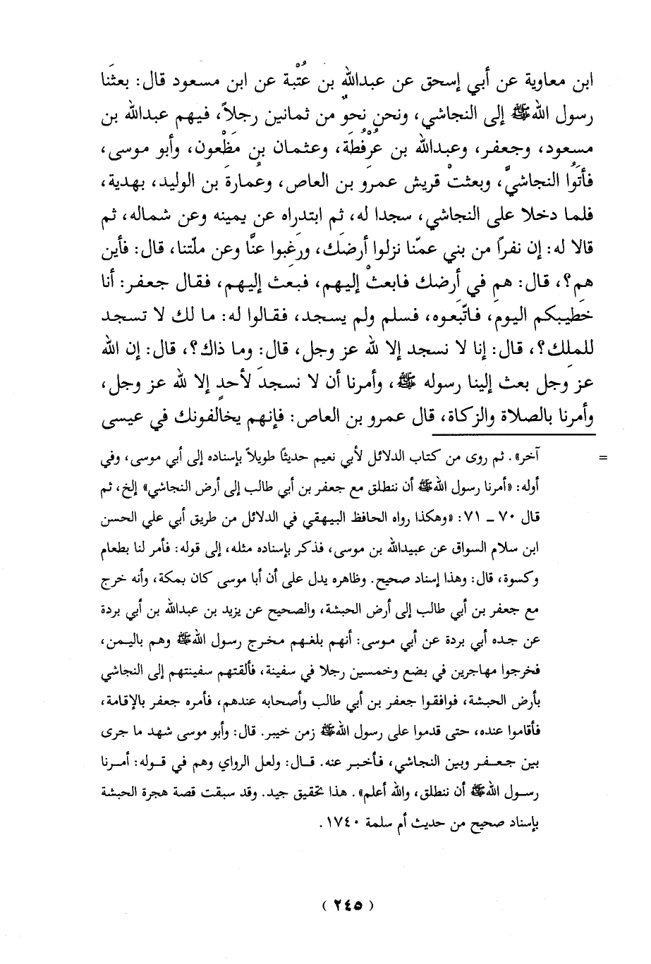= آخر". ثم روى من كتاب الدلائل لأبي نعيم حديثاً طويلاً بإسناده إلى أبي موسى، وفي أوله: "أمرنا رسول الله - صلى الله عليه وسلم - أن ننطلق مع جعفر بن أبي طالب إلى أرض النجاشي" إلخ، ثم قال 70 - 71: "وهكذا رواه الحافظ البيهقي في الدلائل من طريق أبي على الحسن ابن سلام السواق عن عبيد الله بن موسى، فذكر بإسناده مثله، إلى قوله: فأمر لنا بطعام وكسوة، قال: وهذا إسناد صحيح. وظاهره يدل على أن أبا موسى كان بمكة، وأنه خرج مع جعفر بن أبي طالب إلى أرض الحبشة، والصحيح عن يزيد بن عبد الله بن أبي بردة عن جده أبي بردة عن أبي موسى: أنهم بلغهم مخرج رسول الله - صلى الله عليه وسلم - وهم باليمن، فخرجوا مهاجرين في بضع وخمسين رجلاً في سفينة، فألقتهم سفينتهم إلى النجاشي بأرض الحبشة، فوافقوا جعفر بن أبي طالب وأصحابه عندهم، فأمره جعفر بالإقامة، فأقاموا عنده، حتى قدموا على رسول الله - صلى الله عليه وسلم - زمن خيبر. قال: وأبو موسى شهد ما جرى بين جعفر وبين النجاشي، فأخبر عنه. قال: ولعل الرواي وهم في قوله: أمرنا رسول الله - صلى الله عليه وسلم - أن ننطلق، والله أعلم". هذا تحقيق جيد. وقد سبقت قصة هجرة الحبشة بإسناد صحيح من حديث أم سلمة 1740.