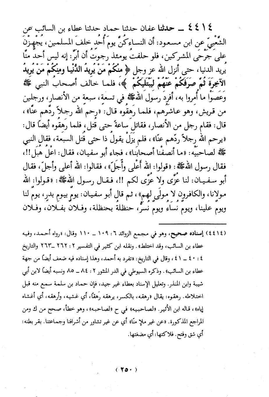 4414 - حدثنا عفان حدثنا حماد حدثنا عطاء بن السائبْ عنِ الشَّعْبِيِّ عن ابن مسعود: أن النساء كُنَّ يومَ أُحُد خلفَ المسلمين، يُجْهِزنَ على جَرْحَى المشركين، فلو حلفتُ يومئذ رجوتُ أن أبَرَّ: إنه ليس أحدٌ منَّا يريد الدنيا، حتى أنزل الله عز وجل {مِنْكُمْ مَنْ يُرِيدُ الدُّنْيَا وَمِنْكُمْ مَنْ يُرِيدُ الْآخِرَةَ ثُمَّ صَرَفَكُمْ عَنْهُمْ لِيَبْتَلِيَكُمْ}، فلما خالف أصحابُ النبي - صلى الله عليه وسلم - وَعَصَوْا ما أُمِروا به، أفرد رسولَ الله - صلى الله عليه وسلم - في تسعة، سبعة من الأنصار، ورجلين من قريش، وهو عاشَرُهم، فلما رَهقُوه قال: "رحم الله رجلاً ردَّهم عنا"، قال: فقام رجل من الأنصار، فقاتلٍ ساعةً حتى قُتل، فلما رَهقُوه أيضاً قال: "يرحم الله رجلاً ردّهم عنا"، فلمِ يزلْ يقول ذا حتى قُتل السبَعة، فقال النبي - صلى الله عليه وسلم - لصاحبيه: "ما أنصفْنا أصحابنا"، فجاء أبو سفيان، فقال: اعْلُ هُبَل!!، فقال رسول الله -صلي الله عليه وسلم-: "قولوا: الله أَعْلى وأَجَلّ"، فقالوا: الله أعلى وأجلّ، فقال أبو سفيان: لنا عُزَّى ولا عُزَّى لكم!!، فقال رسول الله -صلي الله عليه وسلم-: "قولوا: الله
