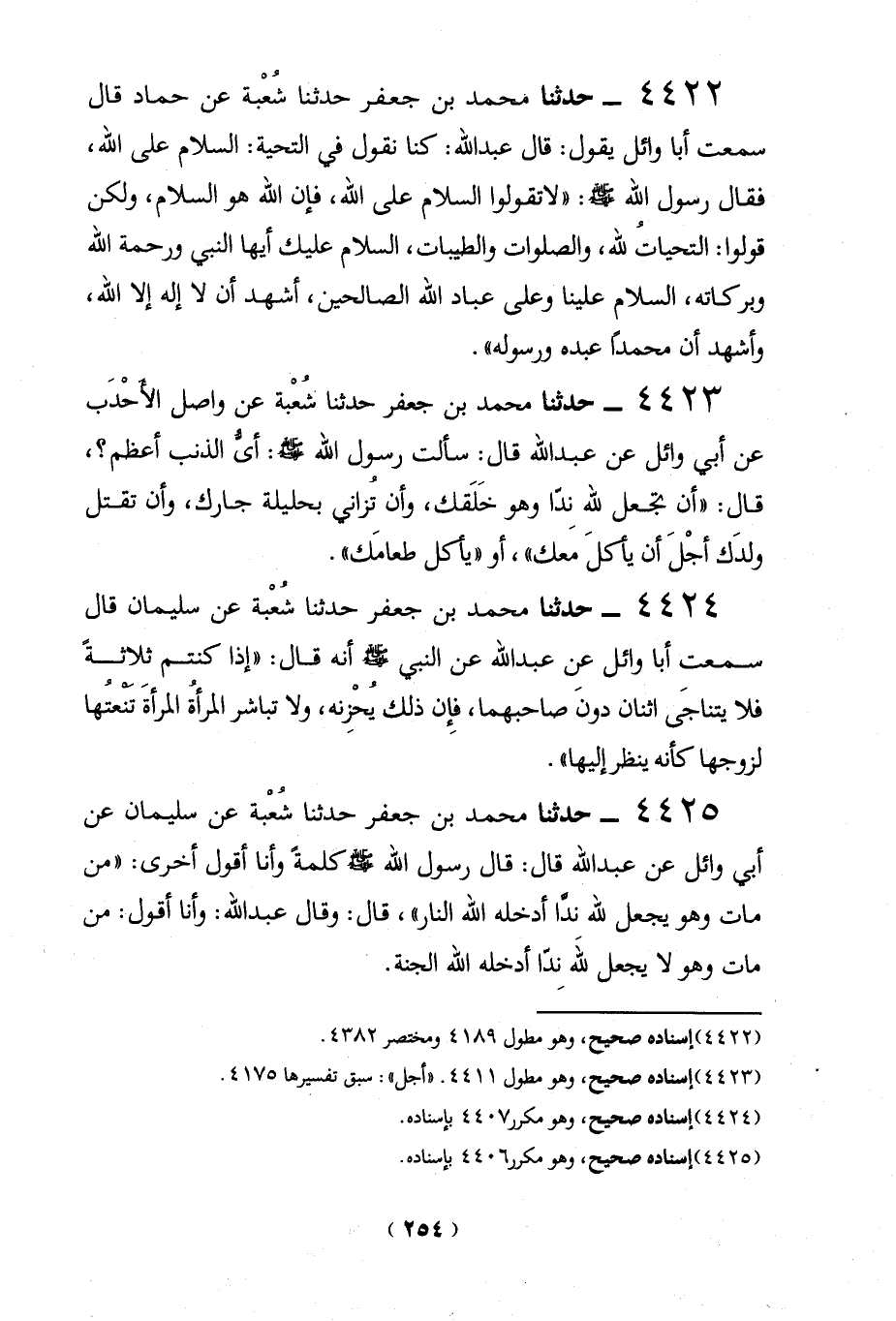 4425 - حدثنا محمد بن جعفر حدثنا شُعْبة عن سليمان عن أبي وائل عن عبد الله قال: قال رسول الله كلمةً وأنا أقول أخرى: "من مات وهو يجعل لله ندَّا أدخله الله النار"، قال: وقال عبد الله: وأنا أقول: من مات وهو لا يجعل لله نِدّا أدخله الله الجنة.