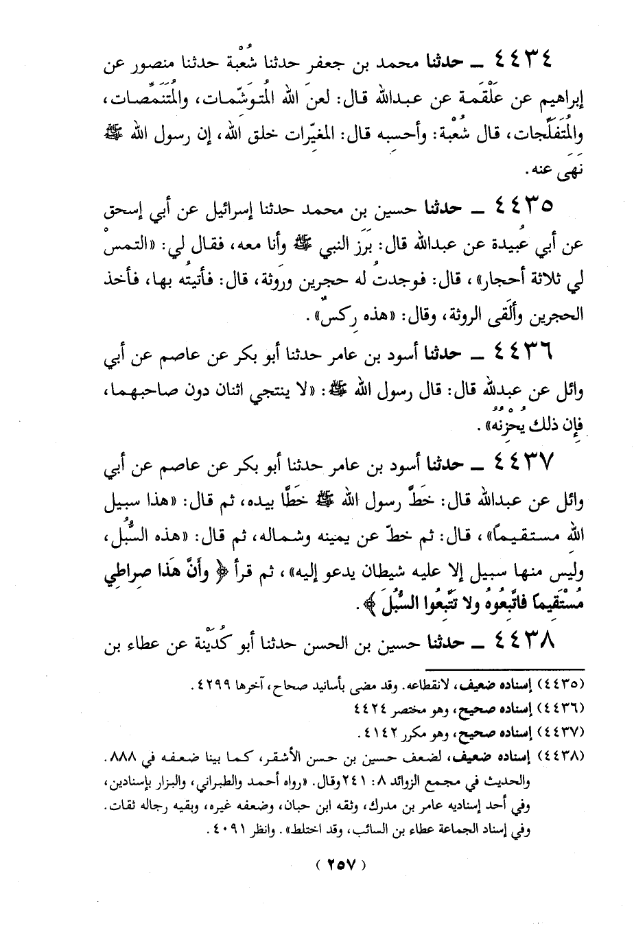 4436 - حدثنا أسود بن عامر حدثنا أبو بكر عن عاصم عن أبي وائل عن عبد لله قال: قال رسول الله -صلي الله عليه وسلم-: "لا ينتجي اثنان دون صاحبهما،. فِإن ذلك يُحْزِنُهُ".