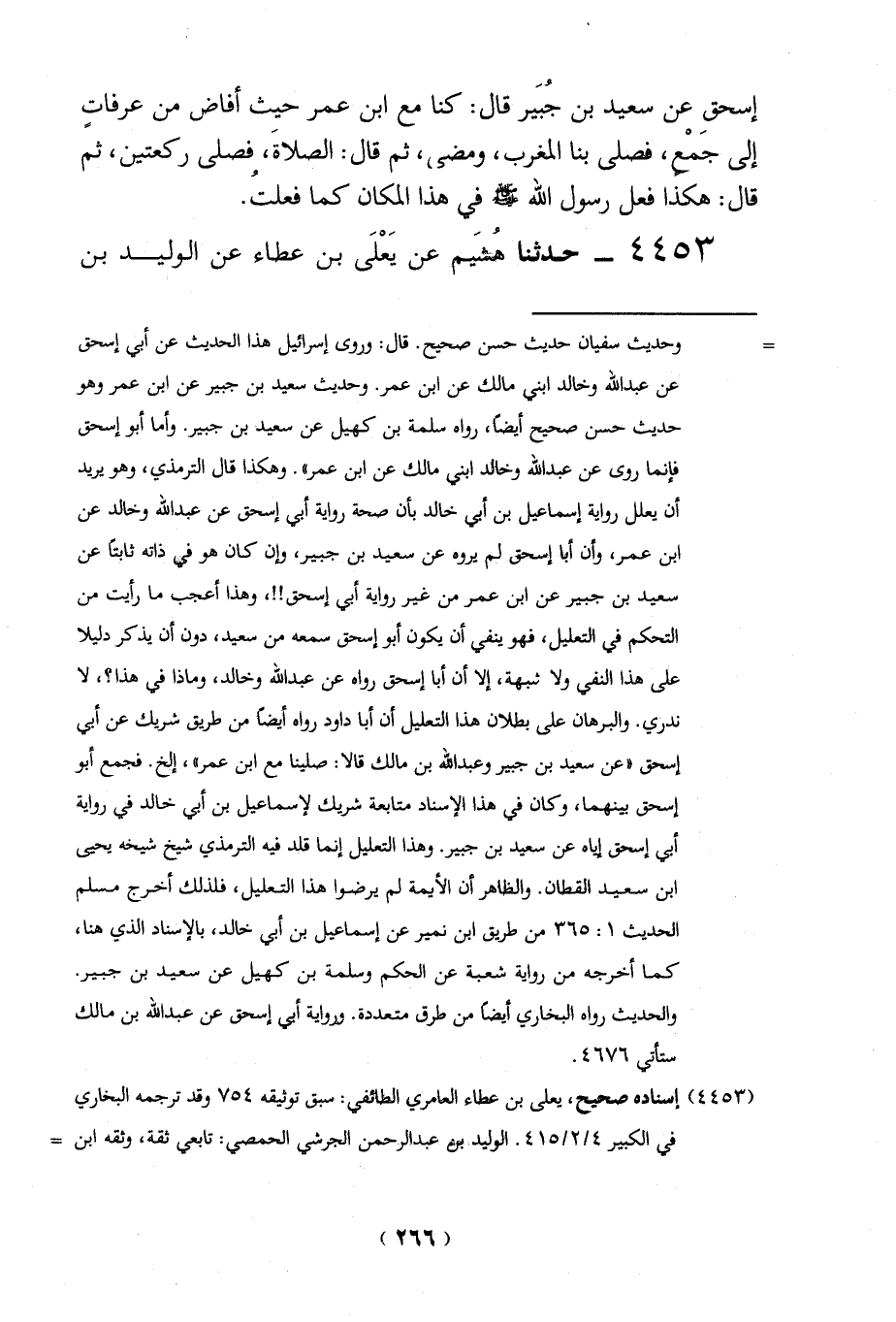 = وحديث سفيان حديث حسن صحيح. قال: وروى إسرائيل هذا الحديث عن أبي إسحق عن عبد الله وخالد ابني مالك عن ابن عمر. وحديث سعيد بن جُبير عن ابن عمر وهو حديث حسن صحيح أيضاً، رواه سلمة بن كهيل عن سعيد بن جُبير. وأما أبو إسحق فإنما روى عن عبد الله وخالد ابني مالك عن ابن عمر". وهكذا قال الترمذي، وهو يريد أن يعلل رواية إسماعيل بن أبي خالد بأن صحة رواية أبي إسحق عن عبد الله وخالد عن ابن عمر، وأن أبا إسحق لم يروه عن سعيد بن جُبير، وإن كان هو في ذاته ثابتاً عن سعيد بن جبير عن ابن عمر من غير رواية أبي إسحق!!، وهذا أعجب ما رأيت من