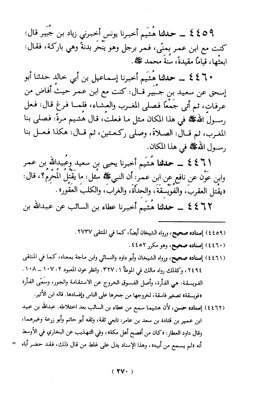 4461 - حدثناهُشَيم أخبرنا يحيى بن سعيد وعُبيد الله بن عمر وابين عَوْن عن نافع عن ابن عمر: أن النبي - صلى الله عليه وسلم - سُئل: ما يَقْتُل المُحْرِمُ؟، قال: "يقُتل العقربَ، والفُوَيسِقَةَ، والحِدأةَ، والغرابَ، والكلبَ العَقُور".