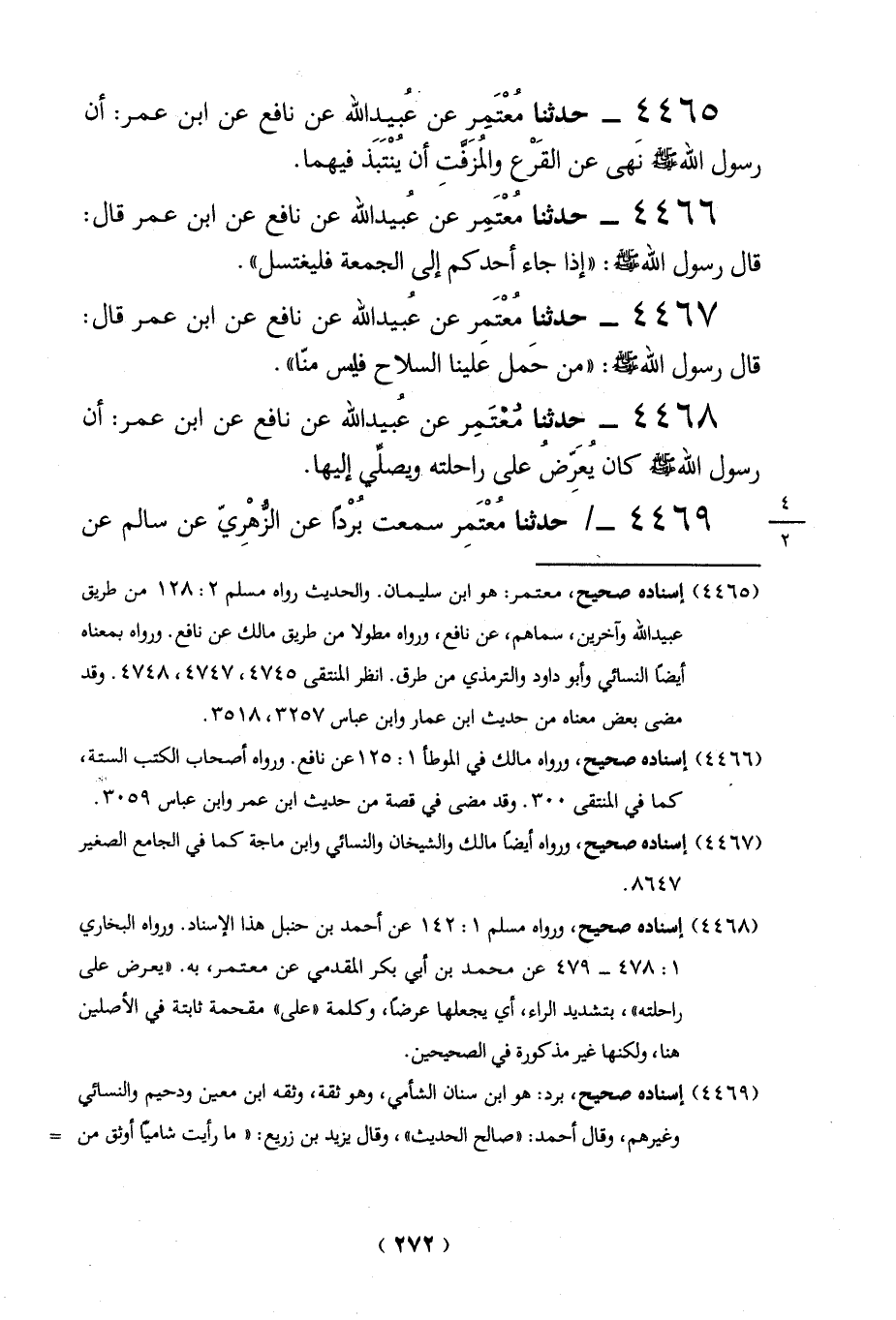 (4465) إسناده صحيح، معتمر: هو ابن سليمان. والحديث رواه مسلم 2: 128 من طريق عبيد الله وآخرين، سماهم، عن نافع، ورواه مطولاً من طريق مالك عن نافع. ورواه بمعناه أيضاً النسائي وأبو داود والترمذي من طرق. انظر المنتقى 4745، 4747، 4748. وقد مضى بعض معناه من حديث ابن عمار وابن عباس 3257، 3518.