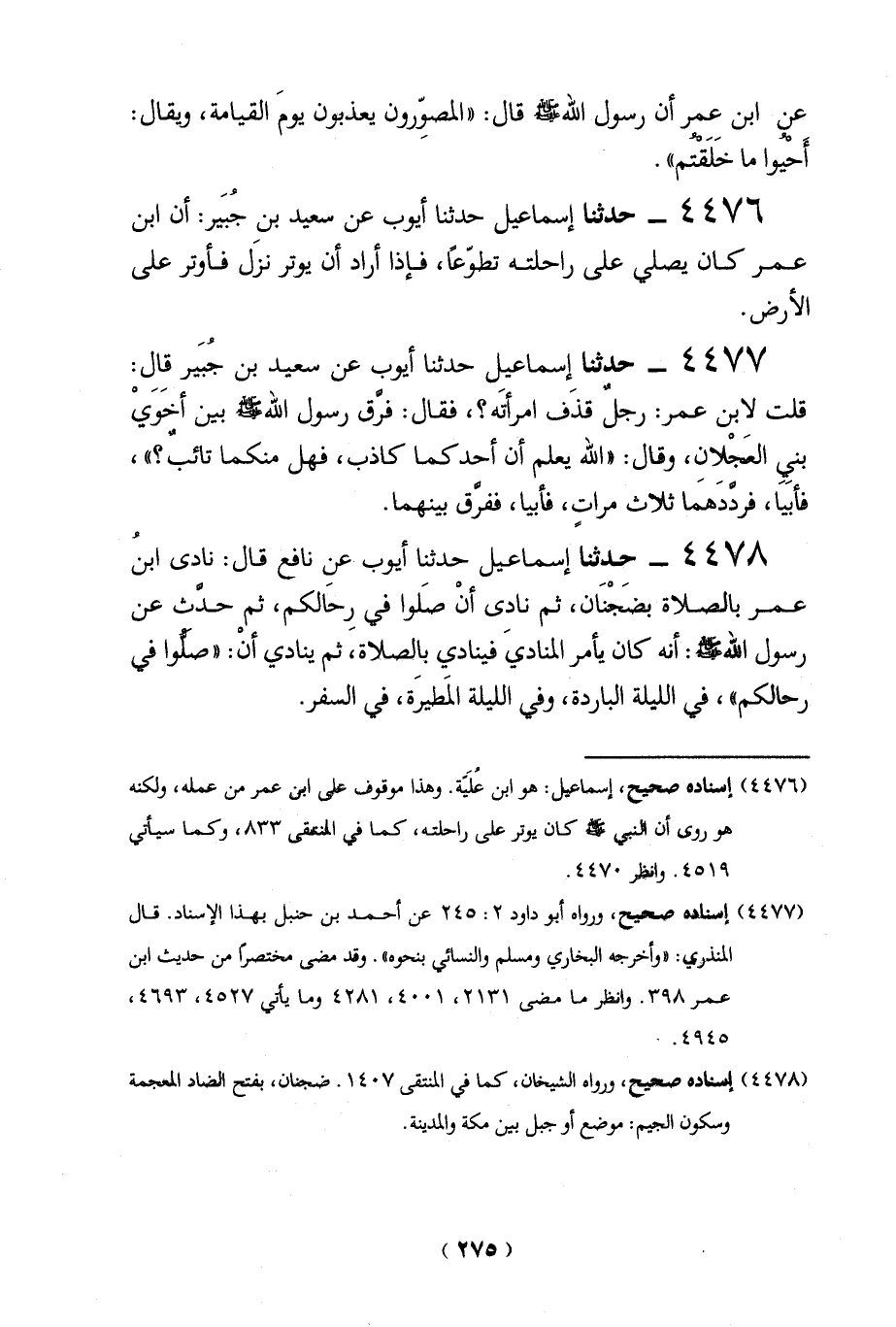 (4476) إسناده صحيح، إسماعيل: هو ابن عُلَيّة. وهذا موقوف علي ابن عمر من عمله، ولكنه هو روى أن النبي - صلى الله عليه وسلم - كان يوتر على راحلته، كما في المنتقى 833، وكما سيأتي 4519. وانظر 4470.