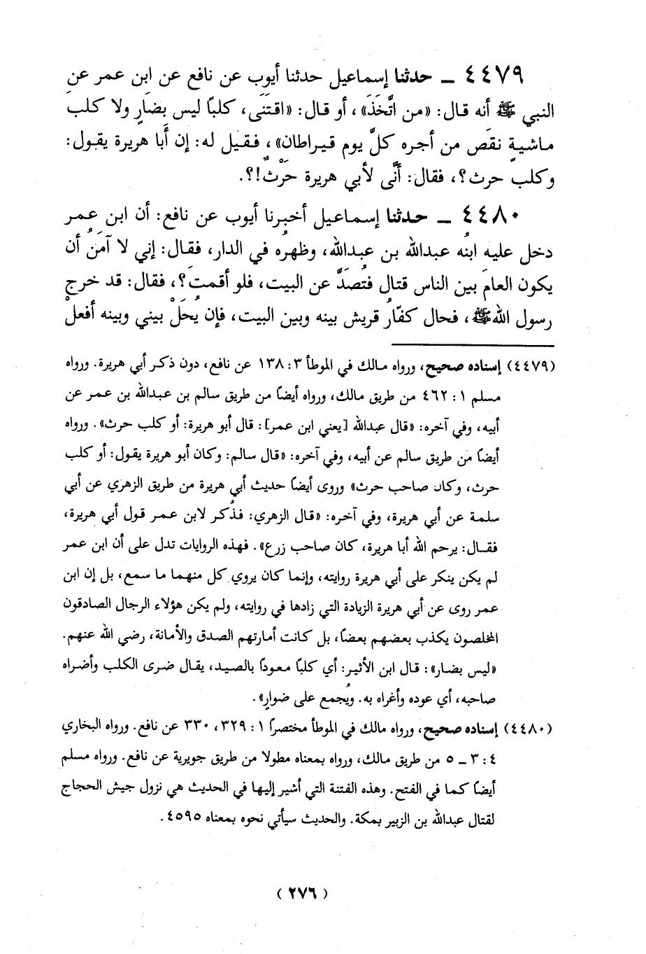 (4479) إسناده صحيح، ورواه مالك في الموطأ 3: 138 عن نافع، دون ذكر أبي هريرة. ورواه مسلم 1: 462 من طريق مالك، ورواه أيضاً من طريق سالم بن عبد الله بن عمر عن أبيه، وفي آخره: "قال عبد الله [يعني ابن عمر]: قال أبو هريرة: أو كلب حرث". ورواه أيضاً من طريق سالم عن أبيه، وفي آخره: "قال سالم: وكان أبو هريرة يقول: أو كلب حرث، وكان صاحب حرث" وروى أيضاً حديث أبي هريرة من طريق الزهزي عن أبي سلمة عن أبي هريرة، وفي آخره: "قال الزهري: فذُكر لابن عمر قول أبي هريرة، فقال: يرحم الله أبا هريرة، كان صاحب زرع". فهذه الروايات تدل على أن ابن عمر لم يكن ينكر على أبي هريرة روايته، وإنما كان يروي كل منهما ما سمع، بل إن ابن