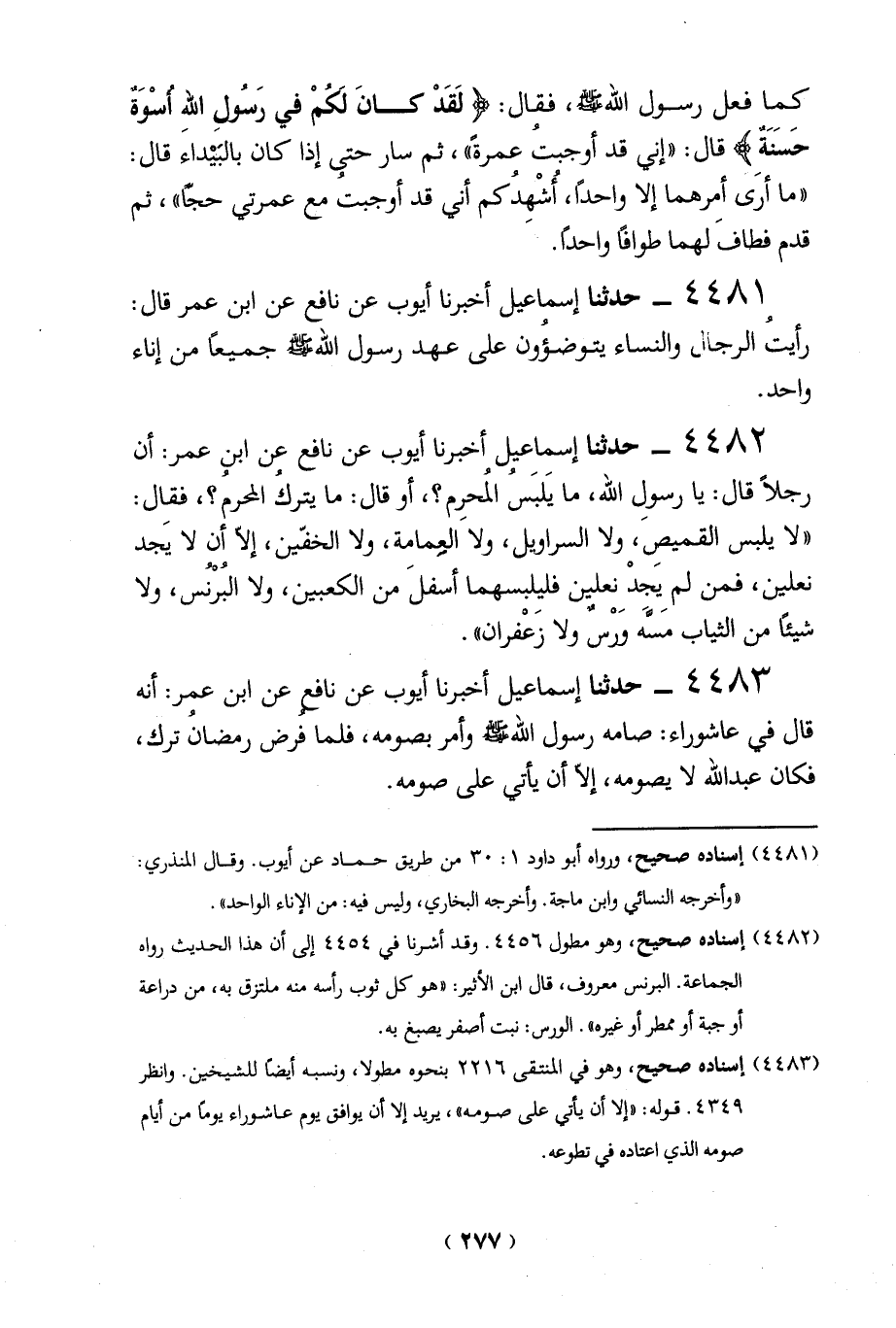 (4482) إسناده صحيح، وهو مطول 4456. وقد أشرنا في 4454 إلى أن هذا الحديث رواه الجماعة. البرنس معروف، قال ابن الأثير: "هو كل ثوب رأسه منه ملتزق به، من دراعة أوجبة أو ممطر أو غيره". الورس: نبت أصفر يصبغ به.