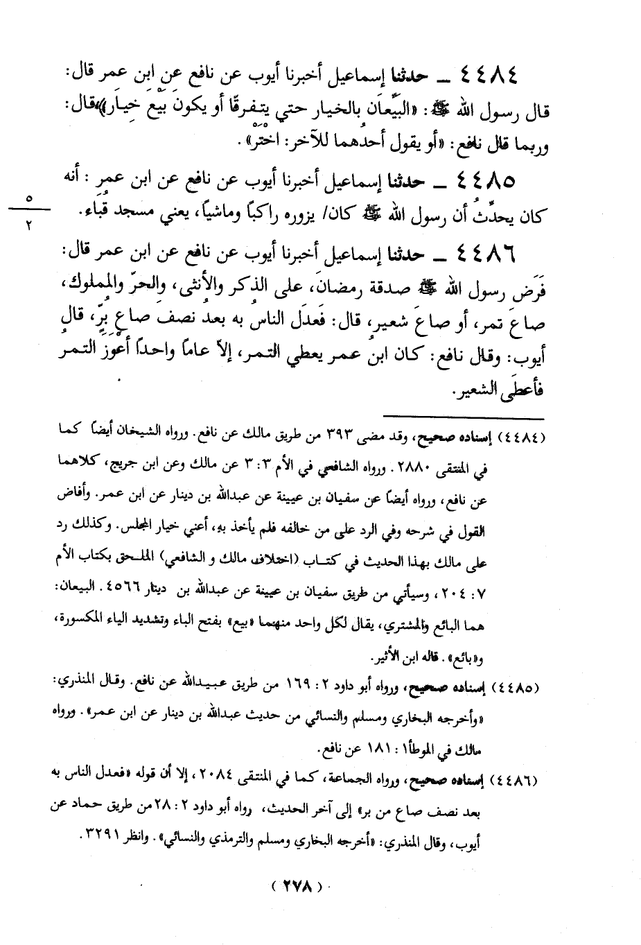 (4484) إسناده صحيح، وقد مضى 393 من طريق مالك عن نافع. ورواه الشيخان أيضاً كما في المنتقى 2880. ورواه الشافعي في الأم 3: 3 عن مالك وعن ابن جُريج، كلاهما عن نافع، ورواه أيضاً عن سفيان بن عيينة عن عبد الله بن دينار عن ابن عمر. وأفاض القول في شرحه وفي الرد علي من خالفه فلم يأخذ به، أعنى خيار المجلس. وكذلك رد على مالك بهذا الحديث في كتاب "اختلاف مالك والشافعي" الملحق بكتاب الأم 7: 204، وسيأتي من طريق سفياق بن عيينة عن عبد الله بن دينار 4566. البيعان: هما البائع والمشتري، يقال لكل واحد منهما "بيع" بفتح الباء وتشديد الياء المكسورة، و"بائع". قاله ابن الأثير.