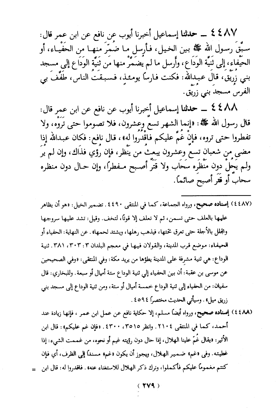 4488 - حدثنا إسماعيل أخبرنا أيوب عن نافع عن ابن عمِر قال: قال رسول الله - صلى الله عليه وسلم -: "إنما الشهر تسعٌ وعشرون، فلا تصوموا حتى تَروْه، ولا تفطروا حتى تروه، فإنْ غُمَّ عليكم فاقْدُرُوا له"، قال نافع: فكان عبد الله إذاِ مضى من شعبان تسعٌ وعشرون يبعثُ من يَنْظر، فإن رُؤي فذَاك، وإن لم يُرَ ولم يَحُلْ دون منظرَ سَحَاب ولا قَتَرٌ أصبح مفطراً، وإن حال دون منظره سحابٌ أو قَتَر أصبح صائماً.