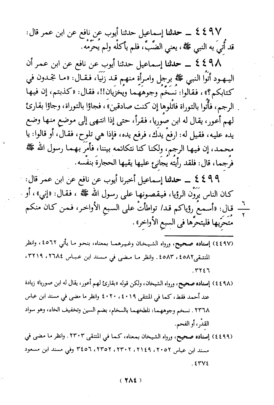 4498 - حدثنا إسماعيل حدثنا أيوب عن نافع عن ابن عمر أن اليهود أتَوُا النبي - صلى الله عليه وسلم - برجل وامرأة منهم قِد زَنَيَا، فقال: "ما تجدون في كتابكم؟ "، فقالوا: نُسَخِّمُ وجوهَهما ويخُزيان!!، فقال: "كذبتم، إن فيها - الرجم، فأْتُوا بالتوراة فاتْلوها إن كنت صادقين"، فجاؤا بالتوراة، وجاؤا بقارئ لهم أعور، يقال له ابن صُورِيا، فقرأ، حتى إذا انتهى إلى موضع منها وضع