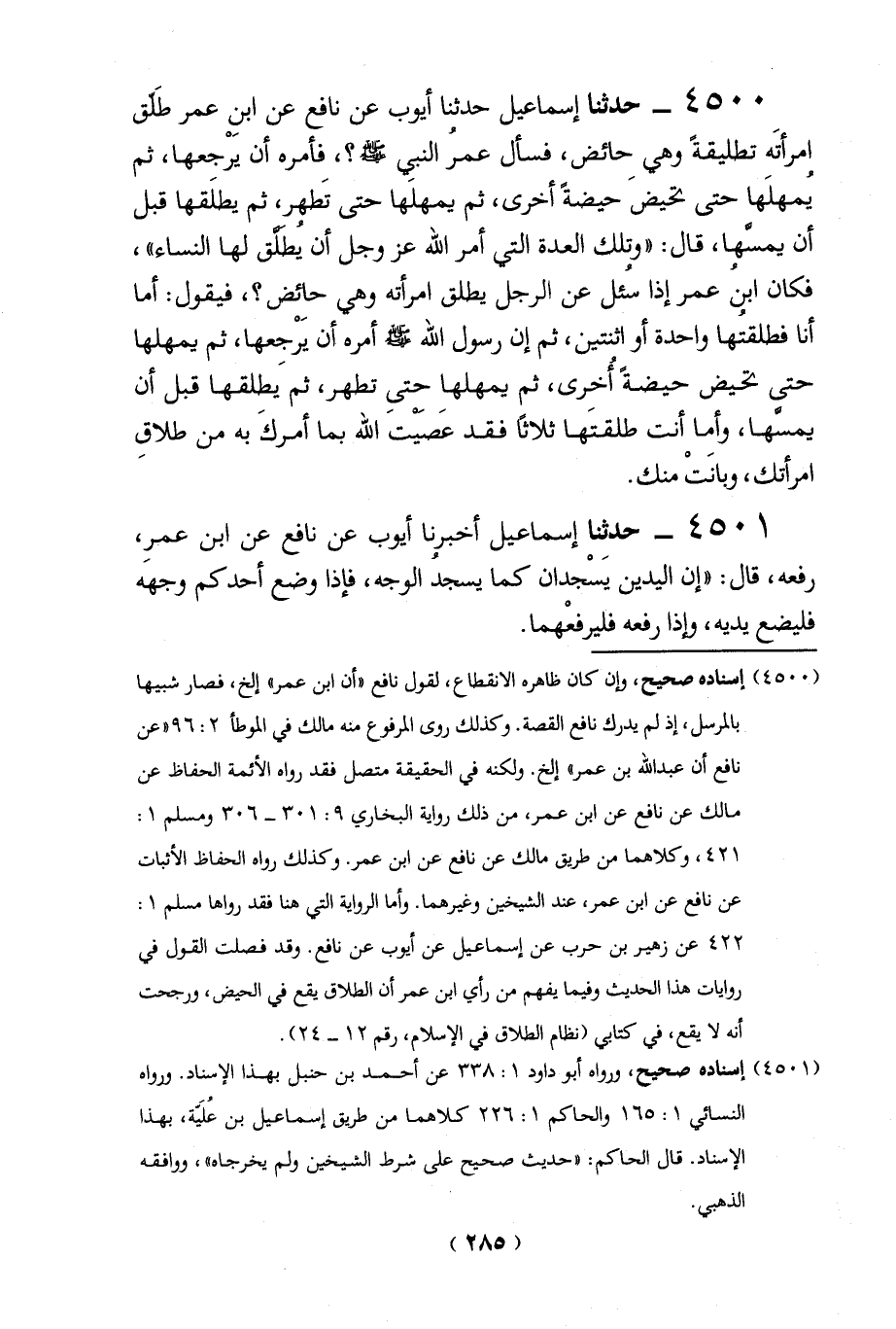 (4500) إسناده صحيح، وإن كان ظاهره الانقطاع، لقول نافع "أن ابن عمر" إلخ، فصار شبيها بالمرسل، إذ لم يدرك نافع القصة. وكذلك روى المرفوع منه مالك في الموطأ 2: 96 "عن نافع أن عبد الله بن عمر" إلخ. ولكنه في الحقيقة متصل فقد رواه الأئمة الحفاظ عن مالك عن نافع عن ابن عمر، من ذلك رواية البخاري 9: 301 - 306 ومسلم 1: 421، وكلاهما من طريق مالك عن نافع عن ابن عمر. وكذلك رواه الحفاظ الأثبات عن نافع عن ابن عمر، عند الشيخين وغيرهما. وأما الرواية التي هنا فقد رواها مسلم1: 422 عن زهير بن حرب عن إسماعيل عن أيوب عن نافع. وقد فصلت القول في روايات هذا الحديث وفيما يفهم من رأي ابن عمر أن الطلاق يقع في الحيض، ورجحت
