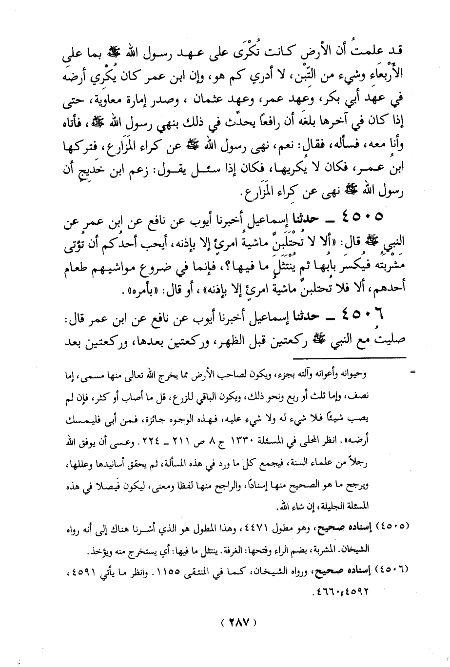 = وحيوانه وأعوانه وآلته بجزء، ويكون لصاحب الأرض مما يخرج الله تعالى منها مسمى، إما نصف، وإما ثلث أو ربع ونحو ذلك، ويكون الباقي للزرع، قل ما أصاب أو كثر، فإن لم يصب شيئاً فلا شيء له ولا شيء عليه، فهذه الوجوه جائزة، فمن أبى فليمسك أرضه". انظر المحلى في المسئلة 1330 ج 8 ص 211 - 224. وعسى أن يوفق الله رجلاً من علماء السنة، فيجمع كل ما ورد في هذه المسألة، ثم يحقق أسانيدها وعللها، ويرجح ما هو الصحيح منها إسنادَا، والراجح منها لفظا ومعنى، ليكون فَيصلا في هذه المسئلة الجليلة، إن شاء الله.