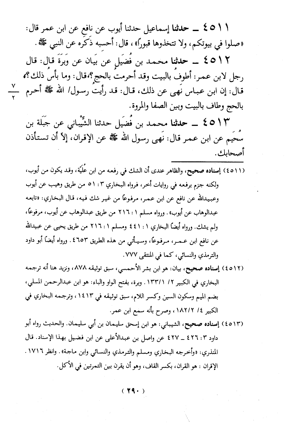 (4512) إسناده صحيح، بيان: هو ابن بشر الأحمسي، سبق توثيقه 878، ونزيد هنا أنه ترجمه البخاري في الكبير 2/ 1 /133. وبرة، بفتح الواو والباء: هو ابن عبد الرحمن المسلي، بضم الميم وسكون السين وكسر اللام، سبق توثيقه في 1413، وترجمه البخاري في الكبير 4/ 2/182، وصرح بأنه سمع ابن عمر.