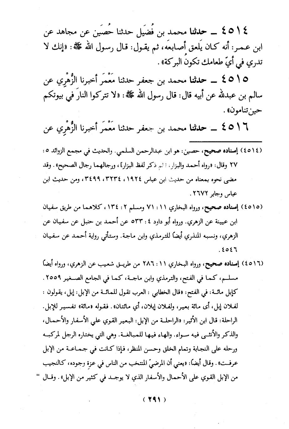 4515 - حدثنا محمد بن جعفر حدثنا مَعْمَرأخبرنا الزُّهْرِي عن سالم بن عبد لله عن أبيه قال: قال رسول الله - صلى الله عليه وسلم -: "لا تتركوا النارَ في بيوتكم حين تنامون".