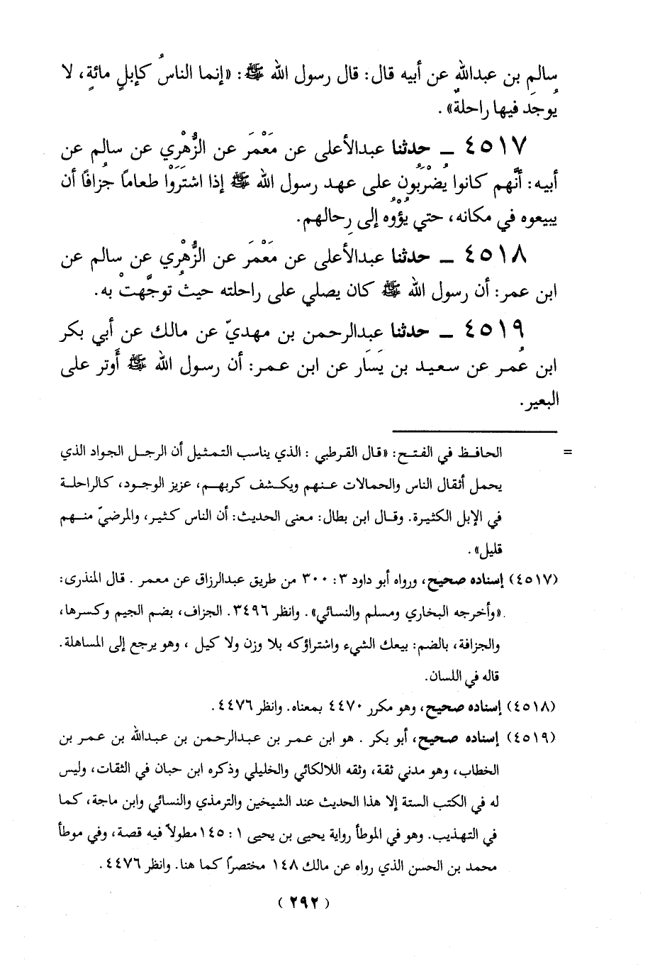 سالمِ بن عبد الله عن أبيه قال: قال رسول الله - صلى الله عليه وسلم -: "إنما الناسُ كإبلٍ مائةٍ، لا