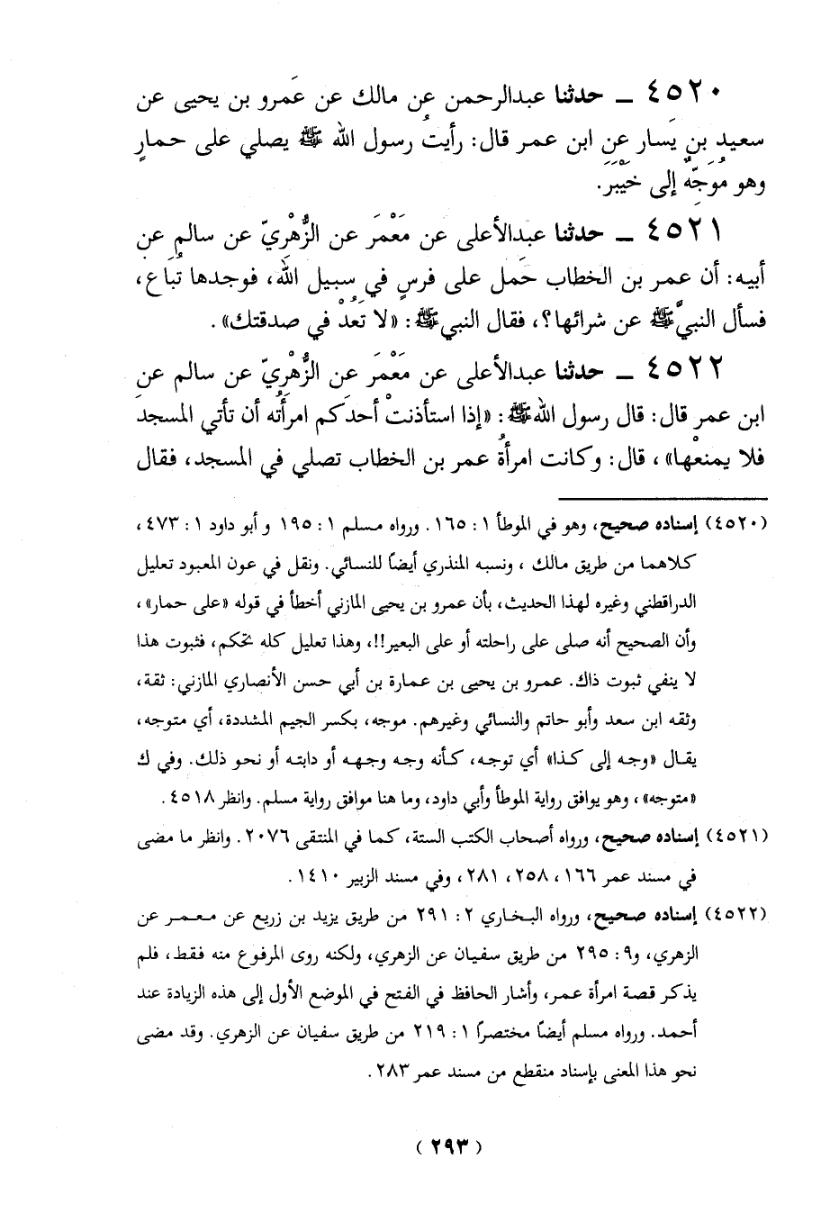 4520 - حدثنا عبد الرحمن عن مالك عن عَمرو بن يحيى عن سعيد بن يَسار عنٍ ابن عمر قال: رأيتُ رسول الله - صلى الله عليه وسلم - يصلي على حمارٍ وهو مُوَجّهٌ إلى خَيْبَرَ.