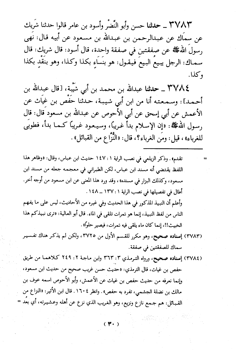 (3783) إسناده صحيح، وهو مكرر للقسم الأول من 3725، ولكن لم يذكر هناك تفسير سماك للصفقتين في صفقة.