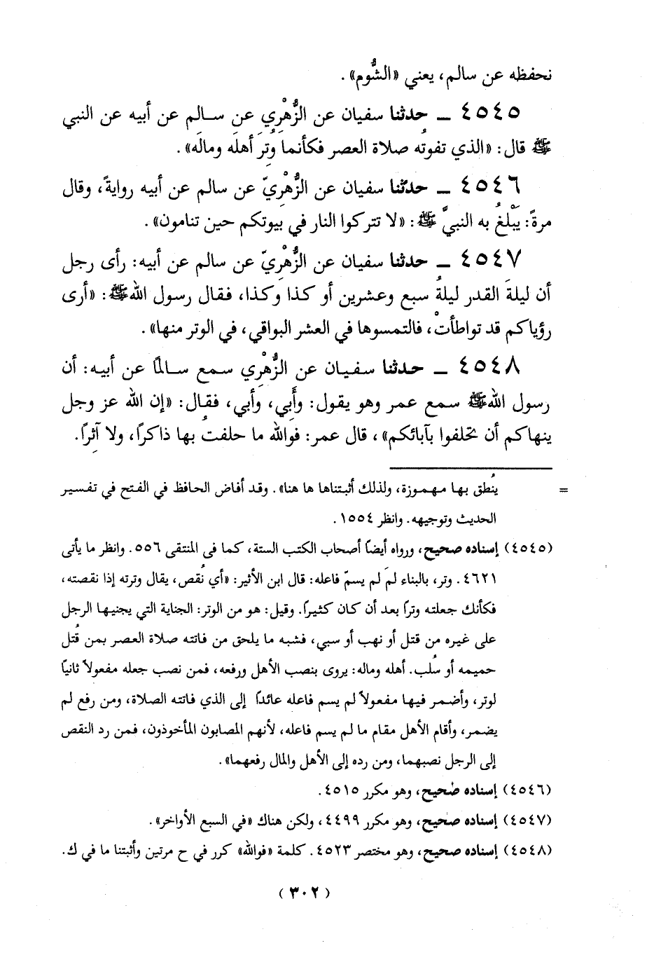 4545 - حدثنا سفيان عن الزُّهْرِيِ عن سالم عن أبيه عن النبي - صلى الله عليه وسلم - قال: "الذي تفوتُه صلاة العصر فكأنما وُتر أهلَه ومالَه".