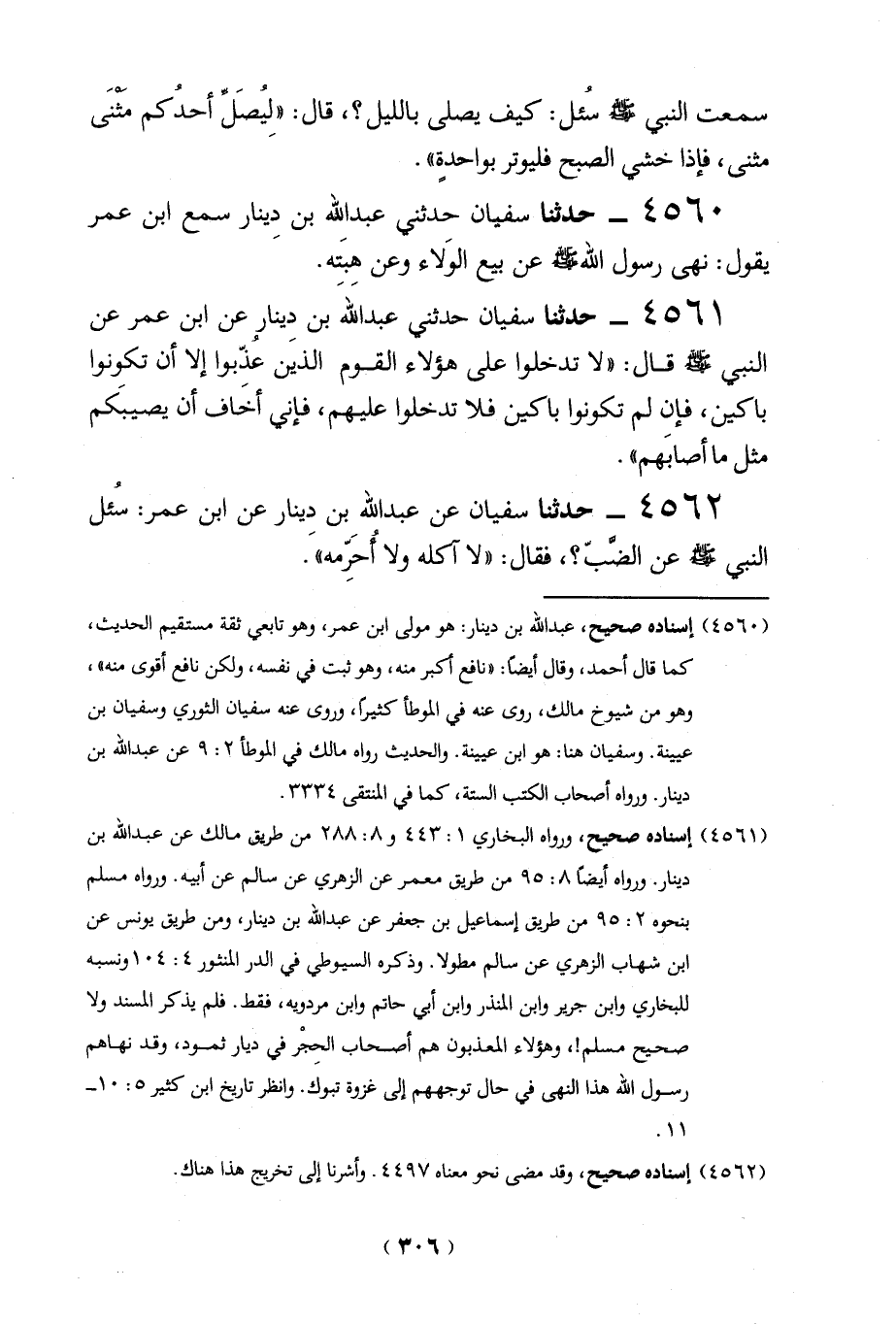 (4560) إسناده صحيح، عبد الله بن دينار: هو مولى ابن عمر، وهو تابعي ثقة مستقيم الحديث، كما قال أحمد، وقال أيضاً: "نافع أكبر منه، وهو ثبت في نفسه، ولكن نافع أقوى منه"، وهو من شيوخ مالك، روى عنه في الموطأ كثيراً، وروى عنه سفيان الثوري وسفيان بن عيينة. وسفيان هنا: هو ابن عيينة. والحديث رواه مالك في الموطأ 2: 9 عن عبد الله بن دينار. ورواه أصحاب الكتب الستة، كما في المنتقى 3334.