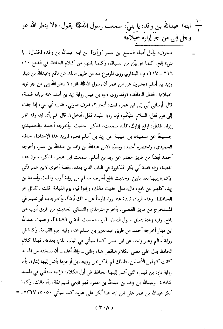 = محرف، ولعل أصله "سمع ابن عمر [ورأى] ابن ابنه عبد الله بن واقد، [فقال]: يا بني" إلخ، كما هو بيّن من السياق، وكما يفهم من كلام الحافظ في الفتح 10: 216 - 217، فإن البخاري روى المرفوع منه من طريق مالك عن نافع وعبد الله بن دينار وزيد بن أسلم " يخبرون عن ابن عمر أن رسول الله - صلى الله عليه وسلم - قال: لا ينظر الله إلى من جر ثوبه خيلاء". فقال الحافظ: "وقد روى داود بن قيس رواية زيد بن أسلم عنه بزيادة قصة، قال: أرسلني أبي إلى ابن عمر، قلت: أدخل؟، فعرف صوتي، فقال: أي بني، إذا جئت إلى قوم فقل: السلام عليكم، فإن ردوا عليك فقل: أدخل؟، قال: ثم رأى ابنه وقد انجر إزاره، فقال: ارفع إزارك، فقد سمعت، فذكر الحديث. وأخرجه أحمد والحميدي جميعاً عن سفيان بن عيينة عن زيد بن أسلم نحوه [يريد هذا الإسناد]، ساقه الحميدي، واختصره أحمد، وسَمَّيا الابن عبد الله بن واقد بن عبد الله بن عمر. وأخرجه أحمد أيضاً من طريق معمر عن زيد بن أسلم: سمعت ابن عمر، فذكره بدون هذه القصة، وزاد قصة أبي بكر المذكورة في الباب الذي بعده، وقصة أخرى لابن عمر تأتي الإشارة إليها بعد بابين. وحديث نافع أخرجه مسلم من رواية أيوب والليث وأسامة بن زيد، كلهم عن نافع، قال، مثل حديا مالك، وزادوا فيه: يوم القيامة. قلت [القائل هو الحافظ]: وهذه الزيادة ثابتة عند رواة الموطأ عن مالك أيضاً، وأخرجها أبو نعيم في المستخرج من طريق القعنبي. وأخرج الترمذي والنسائي الحديث من طريق أيوب عن نافع، وفيه زيادة تتعلق بذيول النساء، [يريد الحديث الماضي 4489]. وحديث عبد الله ابن دينار أخرجه أحمد من طريق عبد العزيز بن مسلم عنه، وفيه: يوم القيامة. وكذا في رواية سالم وغير واحد عن ابن عمر. كما سيأتي في الباب الذي بعده". فهذا كلام الحافظ يدل على معنى الكلام الناقص هنا، وظنى- والله أعلم- أن نسخته من المسند كانت كهذين الأصلين، فلذلك لم يذكر نص روايته، بل أوجزها وأشار إليها إشارة. وأما رواية داود بن قيس، التي أشار إليها الحافظ في أول الكلام، فإنما ستأتي في المسند
